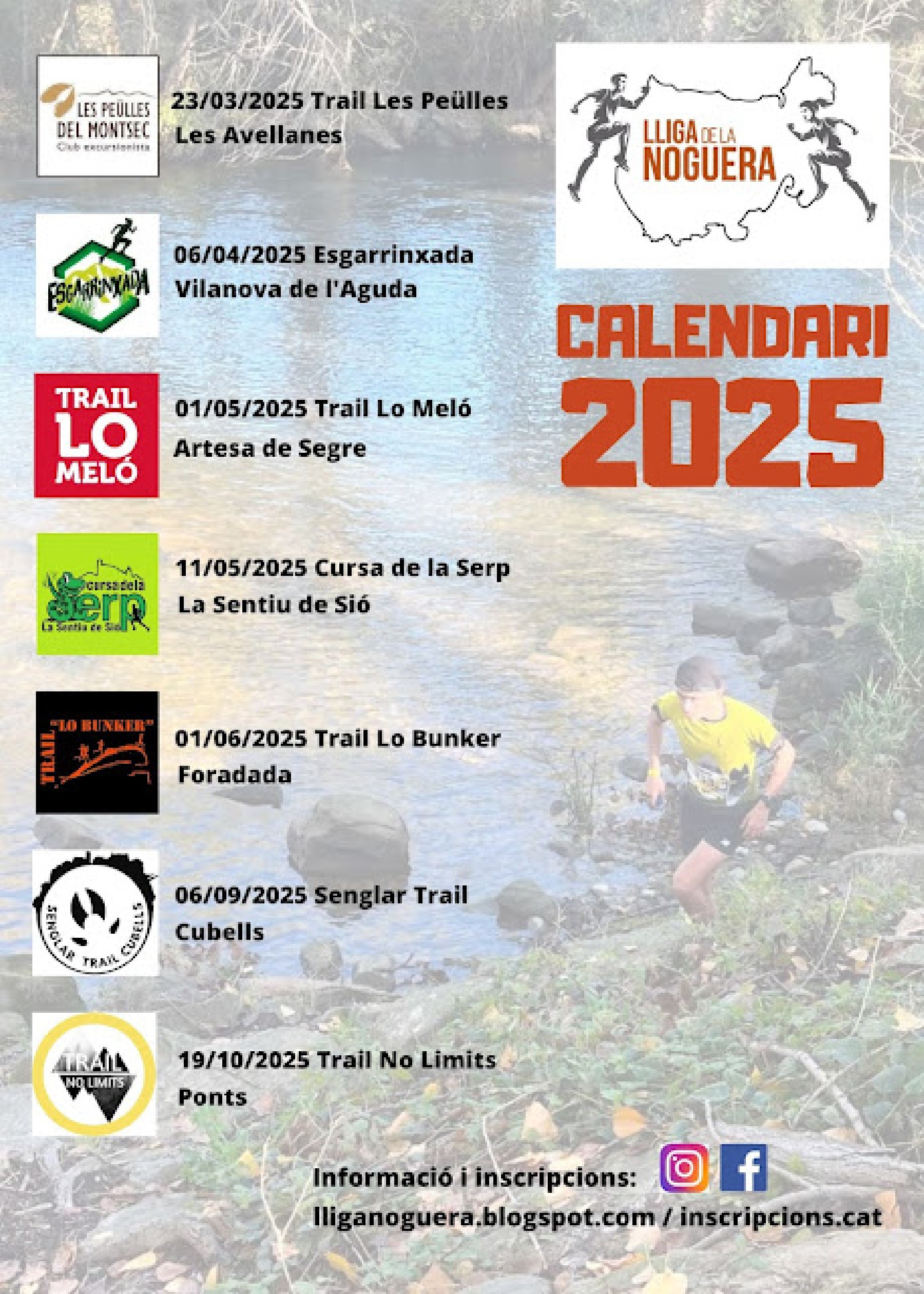 El calendari arrencarà el 23 de març amb el Trail Les Peülles, una cursa que recorre l'entorn impressionant de les Aspres del Montsec, passant per Les Avellanes, Vilanova de la Sal, Santa Linya i Tartareu. Continuarà el 6 d'abril amb l'Esgarrinxada a Vilanova de l'Aguda, que convidarà els participants a endinsar-se en un paisatge únic i desafiant. L'1 de maig, Lo Meló celebrarà la seva 11a edició a Artesa de Segre, consolidant-se com una cita imprescindible al calendari de la Lliga.