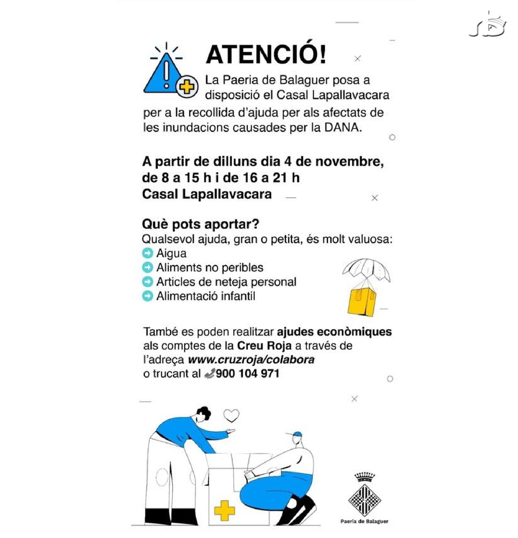 Segons ha explicat a Ràdio Balaguer la paera en cap, Lorena González, davant de les mostres de solidaritat i les ganes de col·laborar expressades per molts ciutadans, la Paeria ha posat a disposició el Casal Lapallavacara perquè qui ho desitgi pugui fer donacions d'aigua, aliments no peribles, articles de neteja o aliments infantils. Les donacions es poden des d'aquest dilluns i fins dissabte, de 8 a 15 h i de 16 a 21 h. Dissabte serà el dia en què camions i furgonetes de particulars i associacions recolliran tot el material per sortir el dilluns dia 11 en direcció al País Valencià.