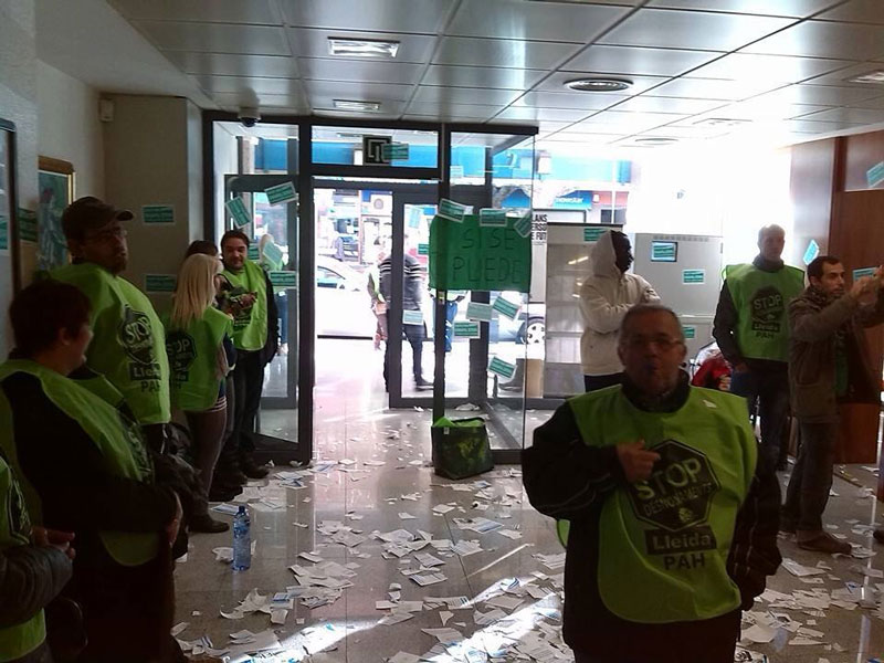 A més de l'ocupació pacífica de l'oficina, els membres de la PAH han desplegat una pancarta als porxos de davant de l'oficina i han enganxat cartells reivindicatius a les portes de l'entitat, ubicada al Passeig de l'Estació, en ple centre de la ciutat.