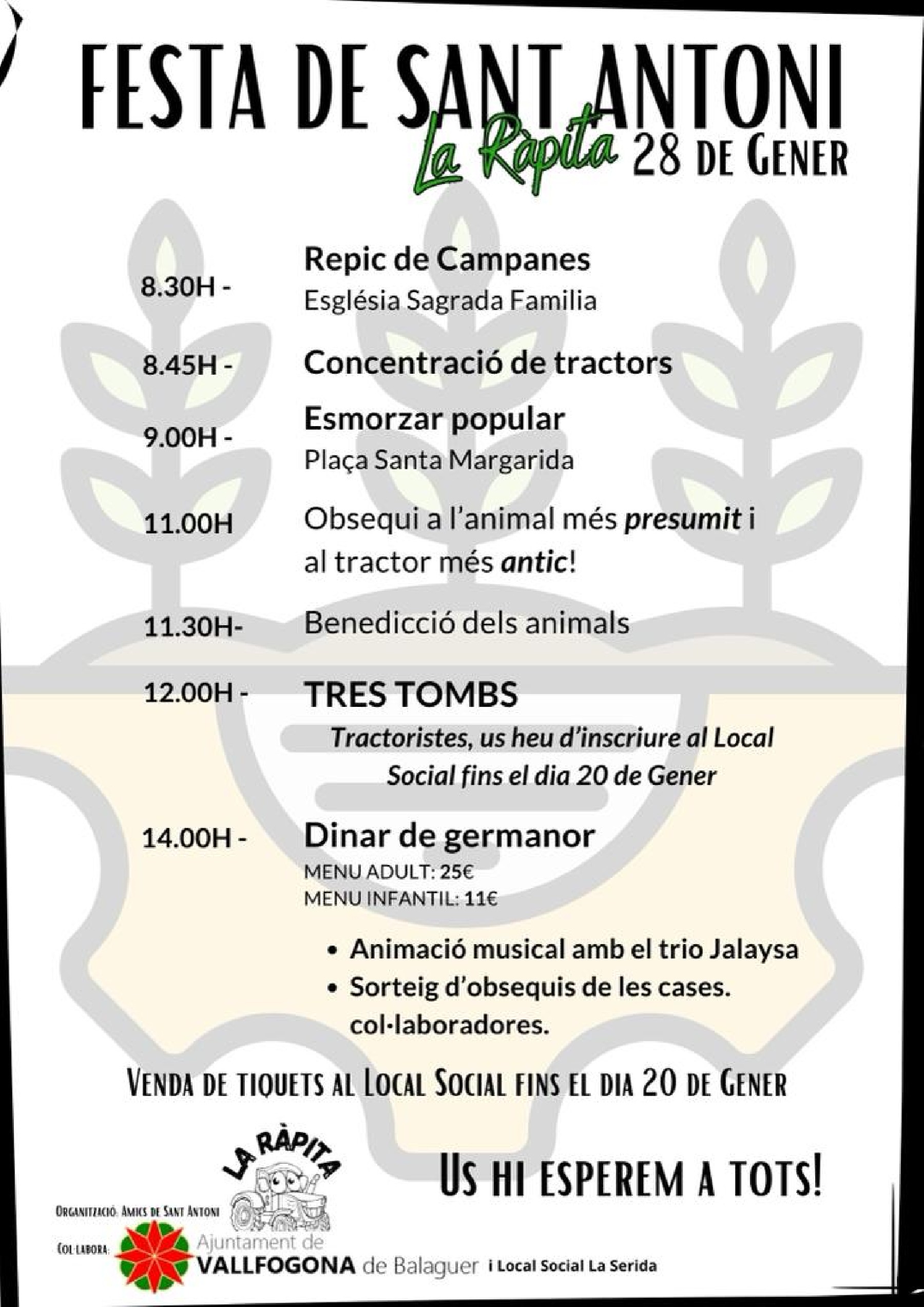 Els Tres Tombs seran a les 12 del migdia i s'acabarà amb un dinar de germanor, que amenitzarà el ball del trio Jalaysa.