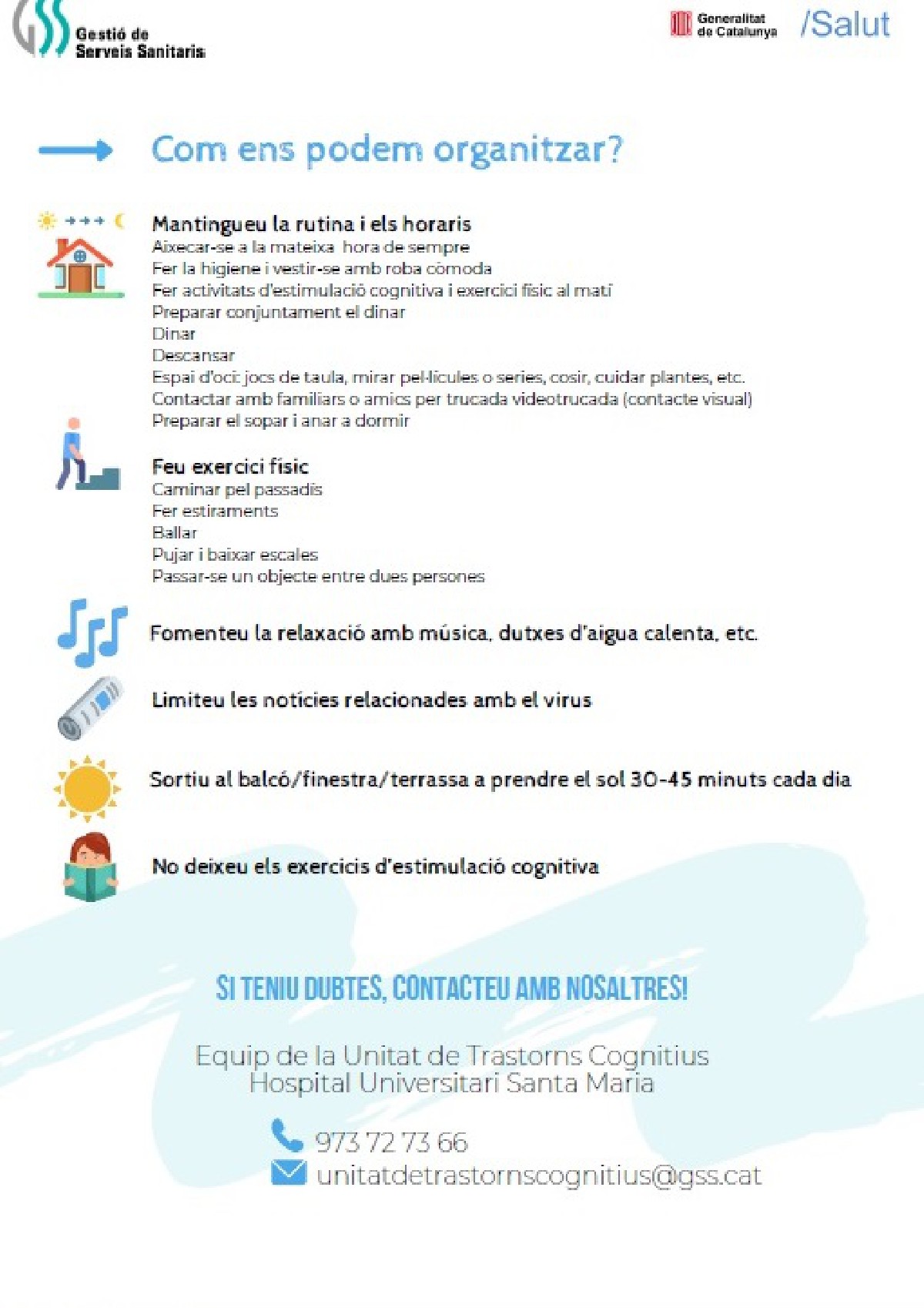 La Unitat de Trastorns Cognitius de l'Hospital Universitari Santa Maria de Lleida ha publicat una guia de consells per als cuidadors de persones amb deteriorament cognitiu durant el confinament. El seu objectiu és oferir recomanacions per tal de gestionar una situació excepcional arrel de la pandèmia del coronavirus i per resoldre alguns dubtes que puguin tenir els cuidadors. La situació de confinament afecta tothom i molt especialment a les persones més vulnerables i dependents, com són les persones amb deteriorament cognitiu i/o demència.