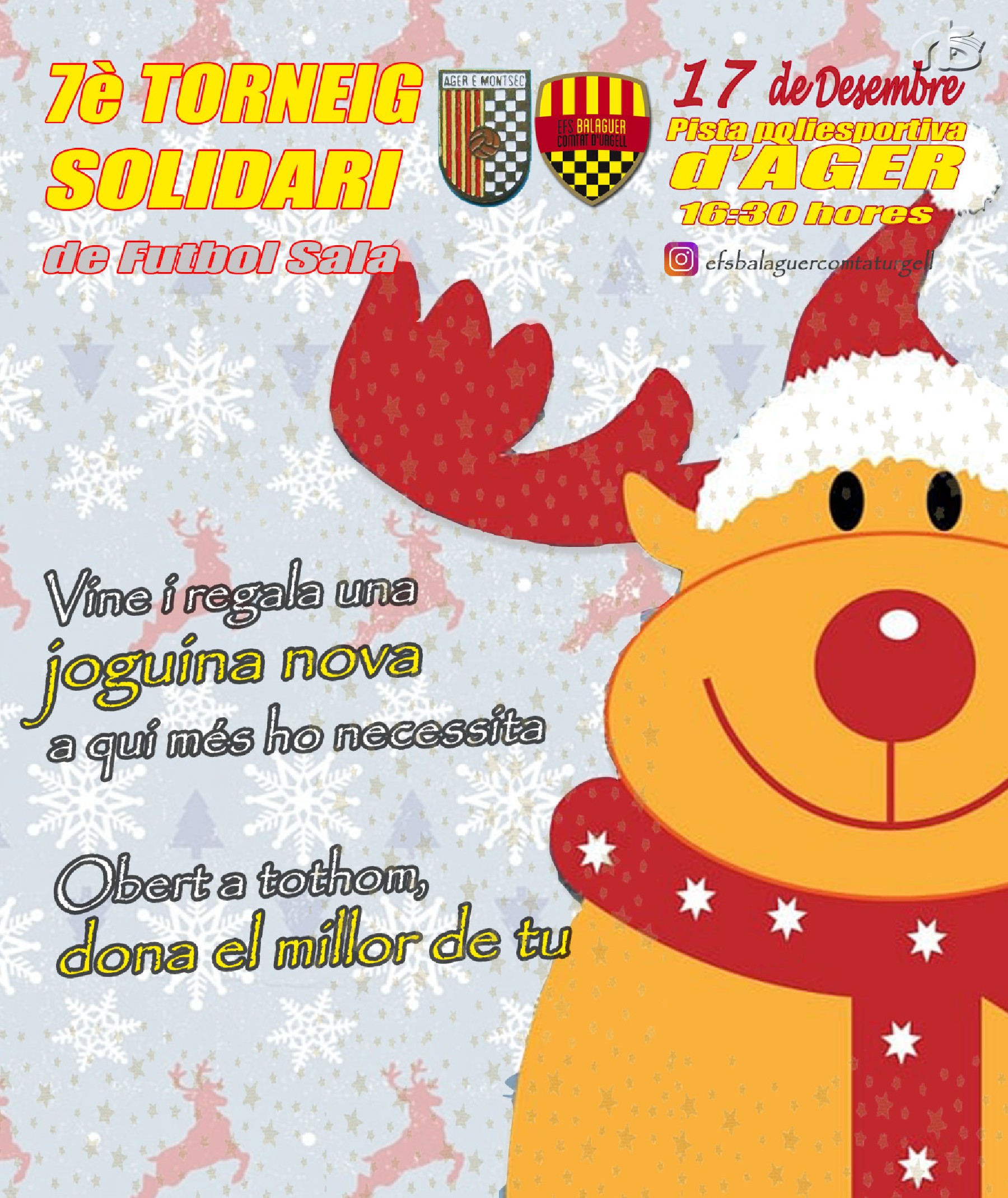 El torneig de futbol sala, que es disputarà entre l'Àger E. Montsec i el EFS Balaguer Comtat d'Urgell, tindrà lloc a les 16.30 hores a la Pista Poliesportiva d'Àger. Es tracta d'un acte obert a tothom i, en aquest sentit, el consistori d'Àger ha fet una crida a totes les persones que hi assisteixin per tal que portin una joguina nova per regalar-la als qui més ho necessiten, amb l'objectiu de poder repartir la recaptació que s'aconsegueixi aquestes festes de Nadal entre les famílies més vulnerables del territori.