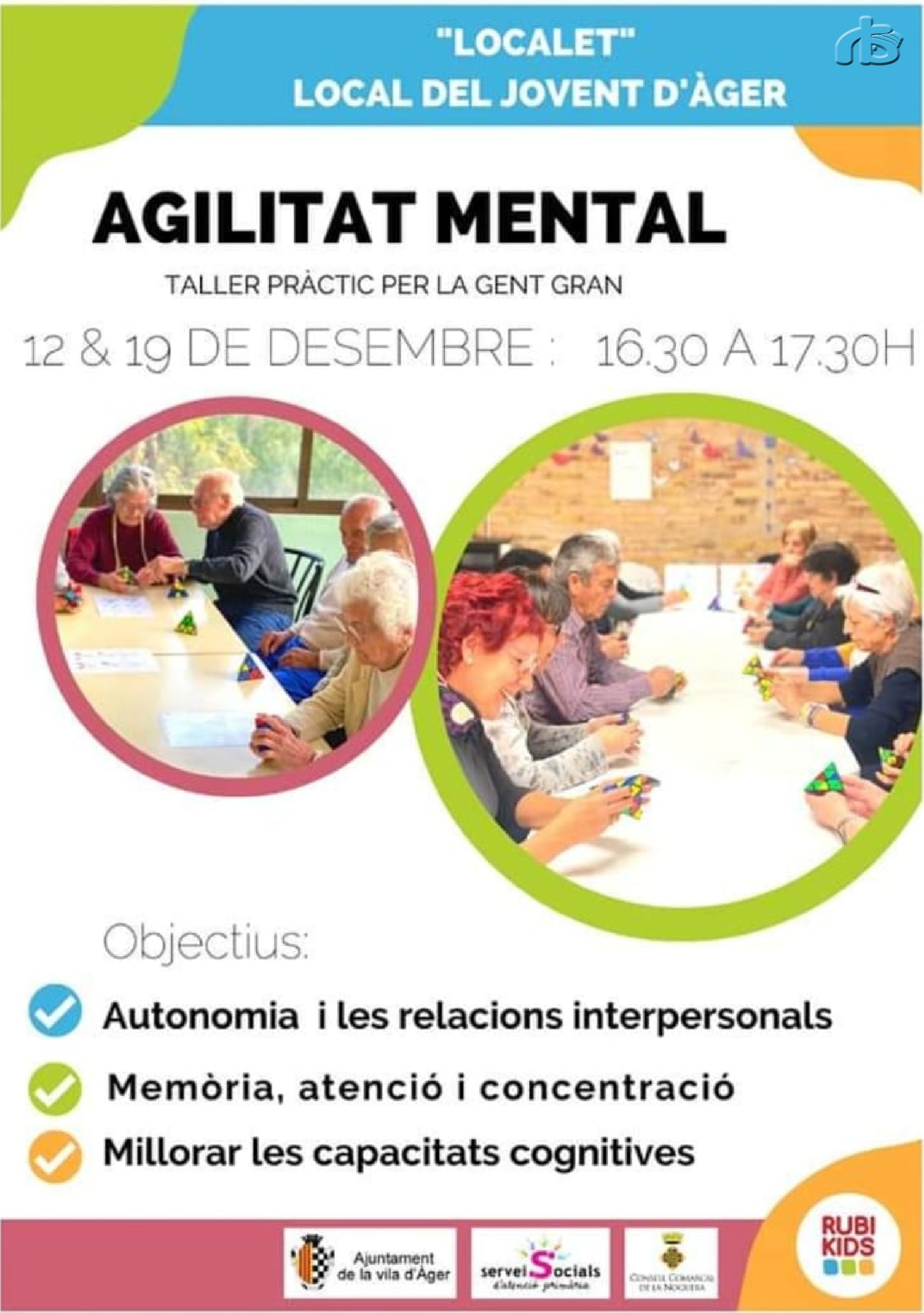 Igualment, aquest dilluns, 12 de desembre, i el pròxim dilluns, 19 de desembre, tindrà lloc un taller pràctic d'agilitat mental destinat a la gent gran del municipi. Es tracta d'una iniciativa que tindrà lloc, ambdós dies, de 16.30 hores a 17.30 hores, al Local del Jovent d'Àger. A través d'aquesta activitat, les persones que hi participin podran treballar l'autonomia i les relacions interpersonals, la memòria, l'atenció i la concentració, així com la millora de les capacitats cognitives. Es tracta d'una iniciativa del Consell Comarcal de la Noguera, l'Ajuntament d'Àger i els Serveis Socials d'atenció primària.