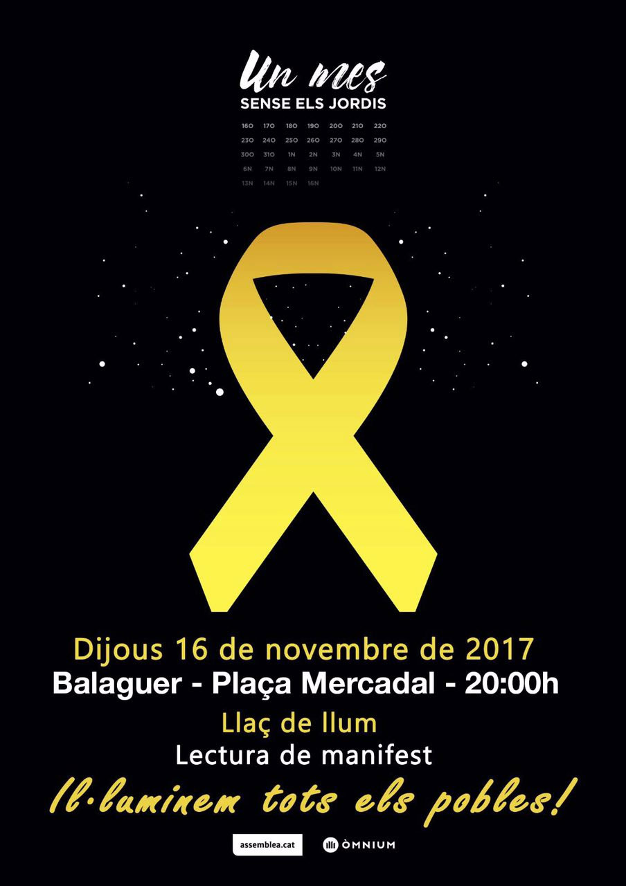 L'Assemblea Nacional Catalana (ANC) ha convocat per aquest dijous al vespre una concentració davant els ajuntaments catalans de suport al president de l'entitat, Jordi Sànchez, i d'Òmnium Cultural, Jordi Cuixart, un mes després del seu empresonament per ordre de la jutgessa de l'Audiència Nacional Carmen Lamela el passat 16 d'octubre. Les concentracions començaran a dos quarts de vuit del vespre a les places dels ajuntaments, mentre que a Barcelona, on està previst que es faci un llaç de llum, serà una hora més tard. Lamela va dictar una ordre de presó incondicional pel presumpte delicte de sedició i des d'aleshores es troben al centre penitenciari de Soto del Real.