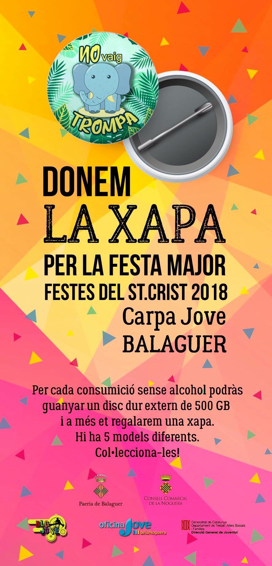 L'àrea de Joventut de l'ajuntament de Balaguer i l'Oficina Jove de la Noguera tornen a engegar la campanya 'Donem la xapa' que pretén potenciar la consumició de begudes no alcohòliques durant els actes de la Festa Major