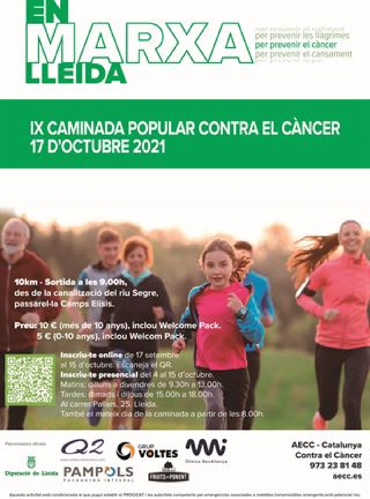 El preu serà de 10 euros per als adults i 5 per als menors de 0 a 10 anys. Amb la inscripció es donarà suport a la lluita contra el càncer, a més d'obtenir un Welcome pack, gaudir de l'esport popular i l'opció a un sorteig on pots guanyar un cap de setmana al Càmping Aigüestortes d'Esterri d'Àneu o al Càmping Santa Elena-Ciutat (Lloret de Mar) o packs d'oli de DOP Les Garrigues, pans de Pastisseria Marqués, una bossa de Kiwisac, una matrícula d'Ilerna Formación, o dos massatges d'Alicia Orellana Alvarez, un sopar al restaurant O Sole Mio o al Restaurant Palermo o un rellotge de la joieria Lavaquial, entre molt altres.