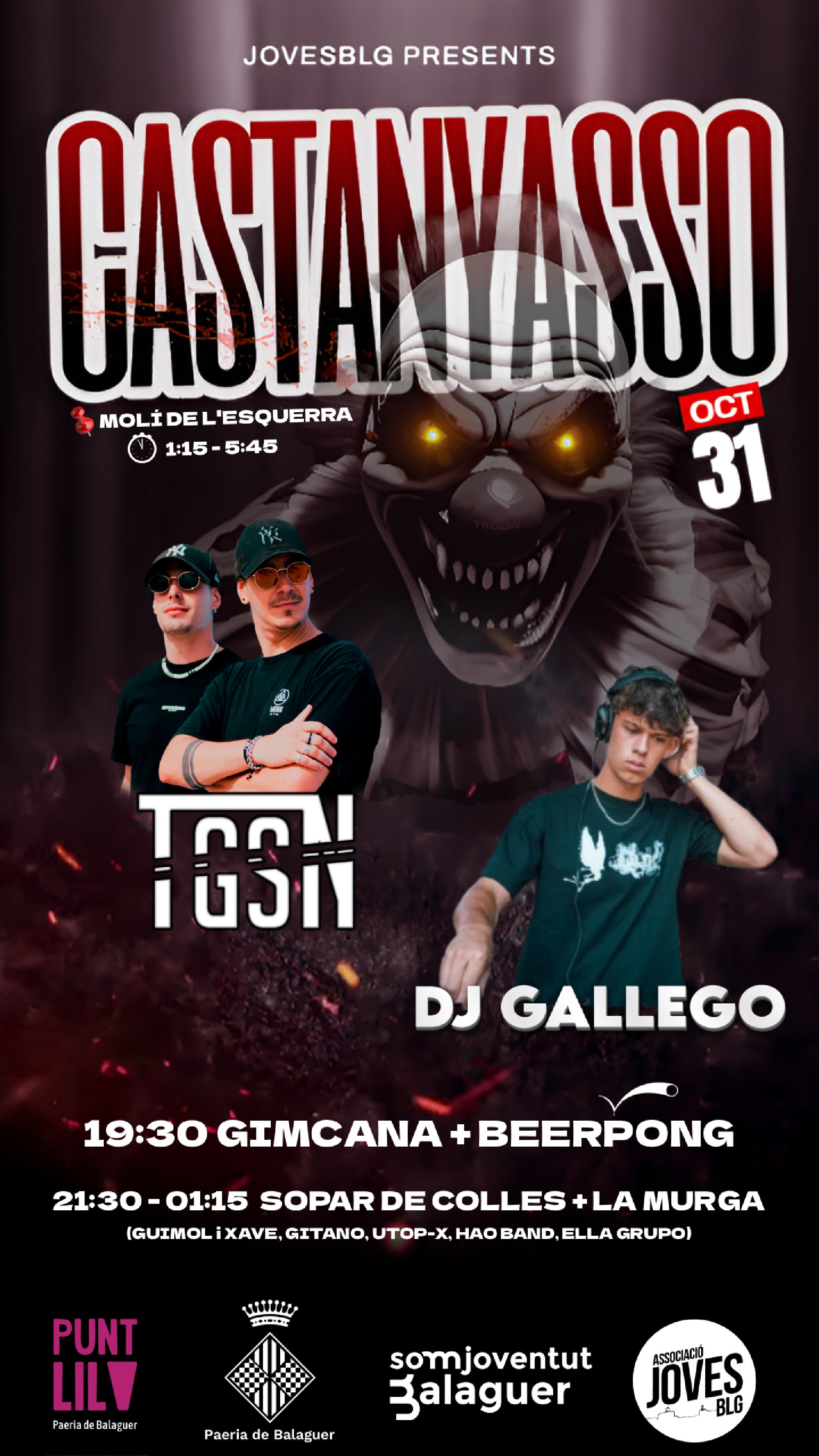 L'Associació Joves BLG organitza la Castanyada amb el 'Castanyasso' al pavelló Molí de l'Esquerrà, que aquest any presenta activitats de tarda, els concerts conjunts amb La Murga i les sessions de dos djs