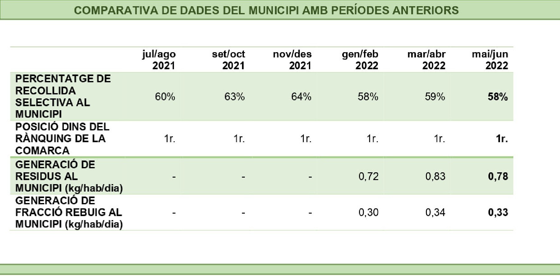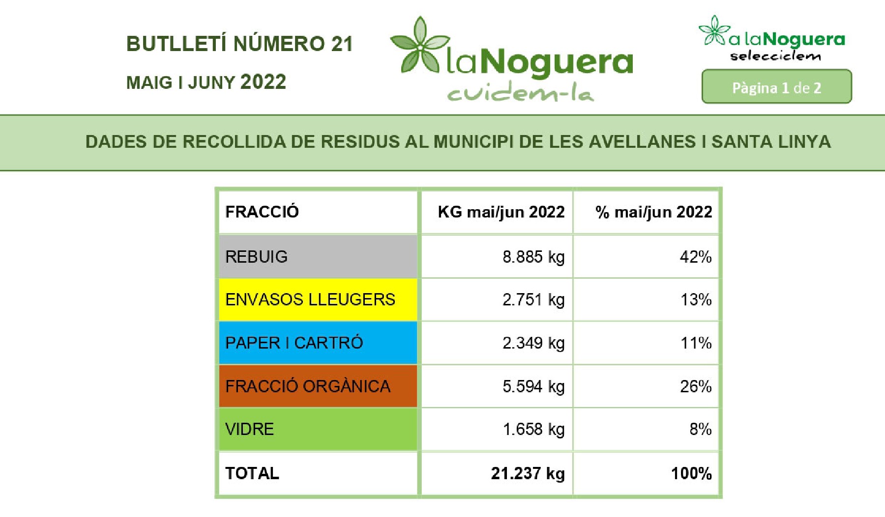 El Consell Comarcal de la Noguera ha fet públic el butlletí amb les dades de la recollida selectiva de residus als diferents municipis de la comarca, unes dades que reflecteixen les xifres que s'han donat durant els mesos de maig i juny d'aquest any.