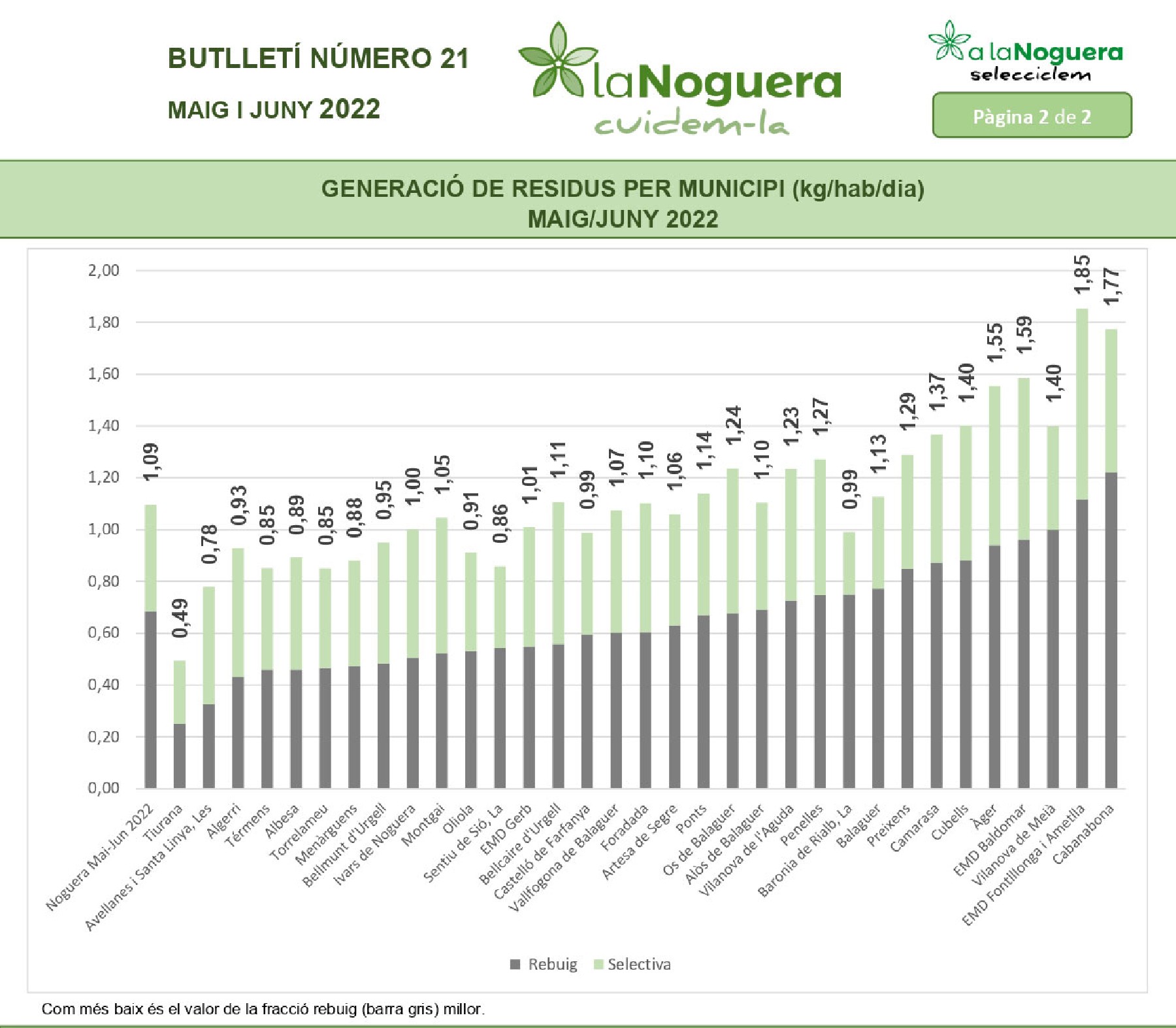 Una altra informació que s'extreu d'aquesta publicació és el volum de residus que genera cada municipi. En aquest cas Tiurana i Les Avellanes són els municipis on es genera menys residus, no arribant al mig quilo per dia i habitant. A l'altre extrem s'hi troben Cabanabona i l'EMD Fontllonga l'Ametlla, on s'arriba a molt més del quilo i mig. A Balaguer es genera més d'1 quilo de residus per dia i habitant.