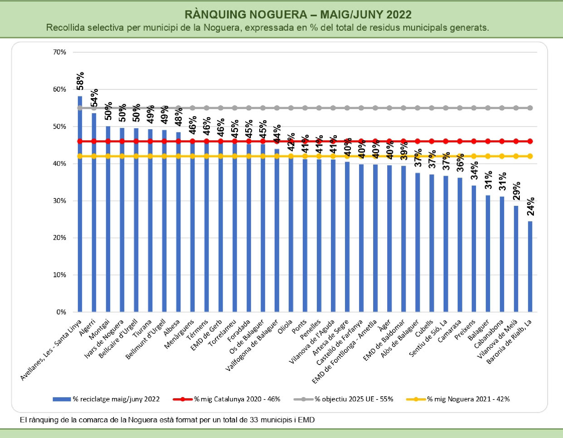 Amb aquestes dades el reciclatge mitja de la comarca de la Noguera es troba en el 42%, unes xifres que són per sota del volum mitjà de reciclatge a nivell de tota Catalunya, on és del 46%, i sobretot, molt per sota dels objectius europeus per a l'any 2025, que recordem que son del 55%.