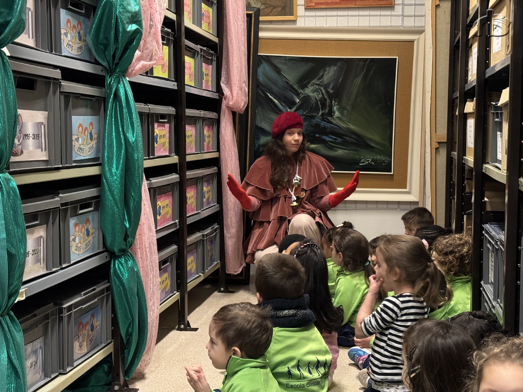 Les tres patgesses dels Reixos reben els infants al casal Lapallavacara de Balaguer i la Pipa els mostra els magatzems del Museu de la Noguera