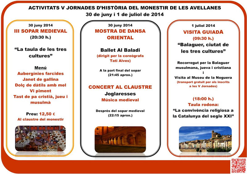 En les V Jornades d'Història del Monestir de les Avellanes (30 de juny i 1 de juliol) entre altres coses es donarà a conèixer diverses mostres de convivència, entre les comunitats religioses jueva, cristiana i musulmana que vivien a Balaguer durant l'edat mitjana.