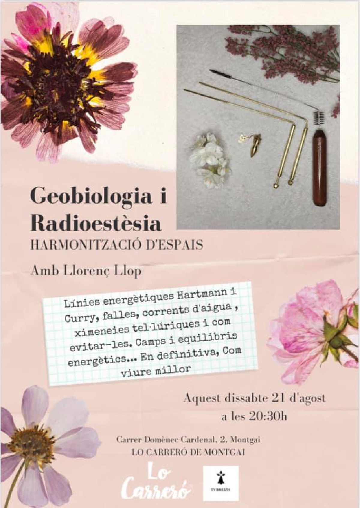 Dissabte s'hi farà un taller explicatiu sobre geobiologia i radioestèsia per harmonitzar espais, a càrrec de Llorenç Llop. També serà a 2/4 de 9 del vespre.
