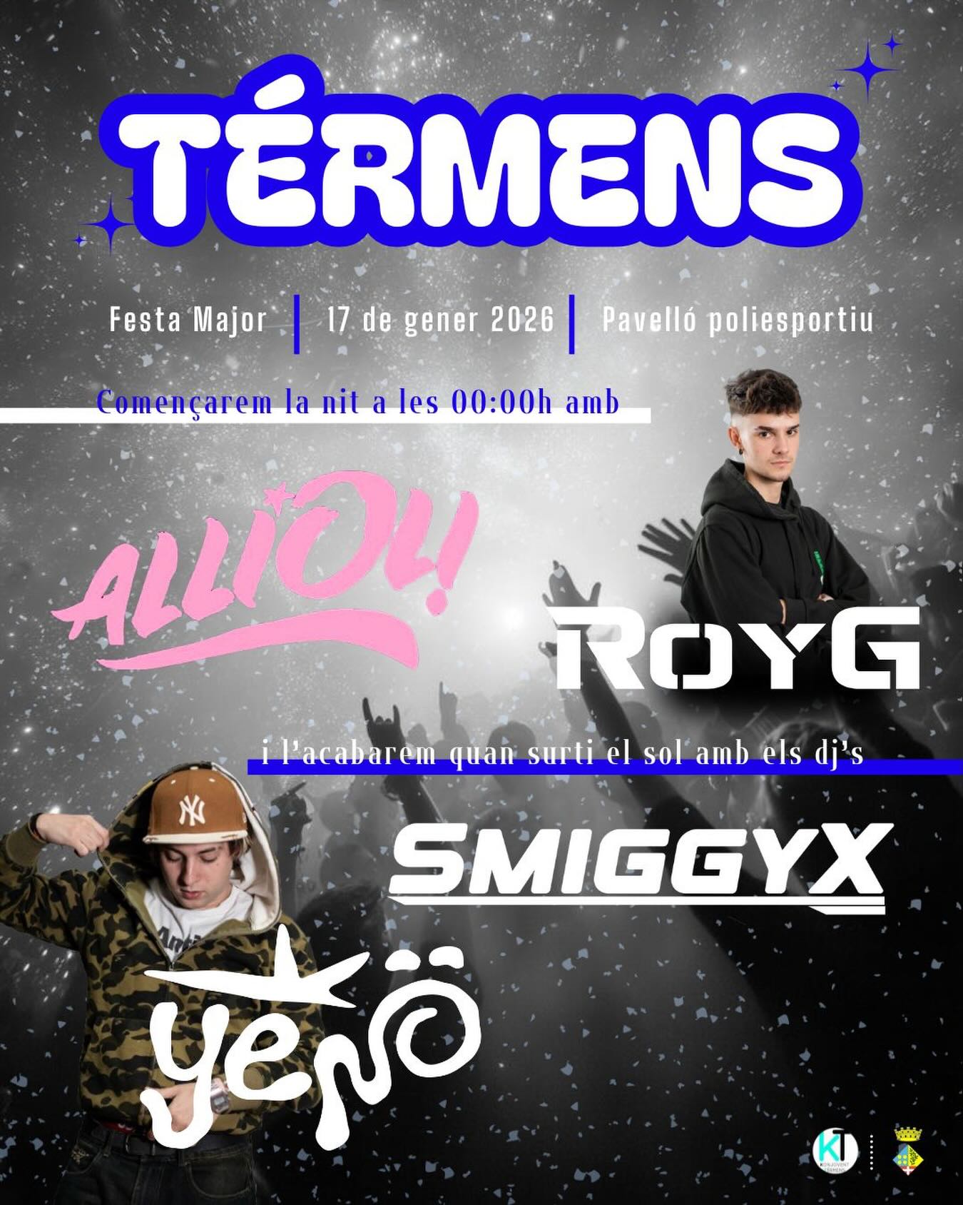 La programació musical de la Festa Major començarà ja dissabte a la nit, també al Pavelló Poliesportiu, amb una proposta pensada per al públic més festiu. La vetllada s’obrirà a les 00 h amb el grup de versions ALL I OLI. A continuació, la música continuarà amb les sessions dels dj’s ROY G i YENÖ, i la nit es tancarà de matinada amb el dj SMIGGYX.