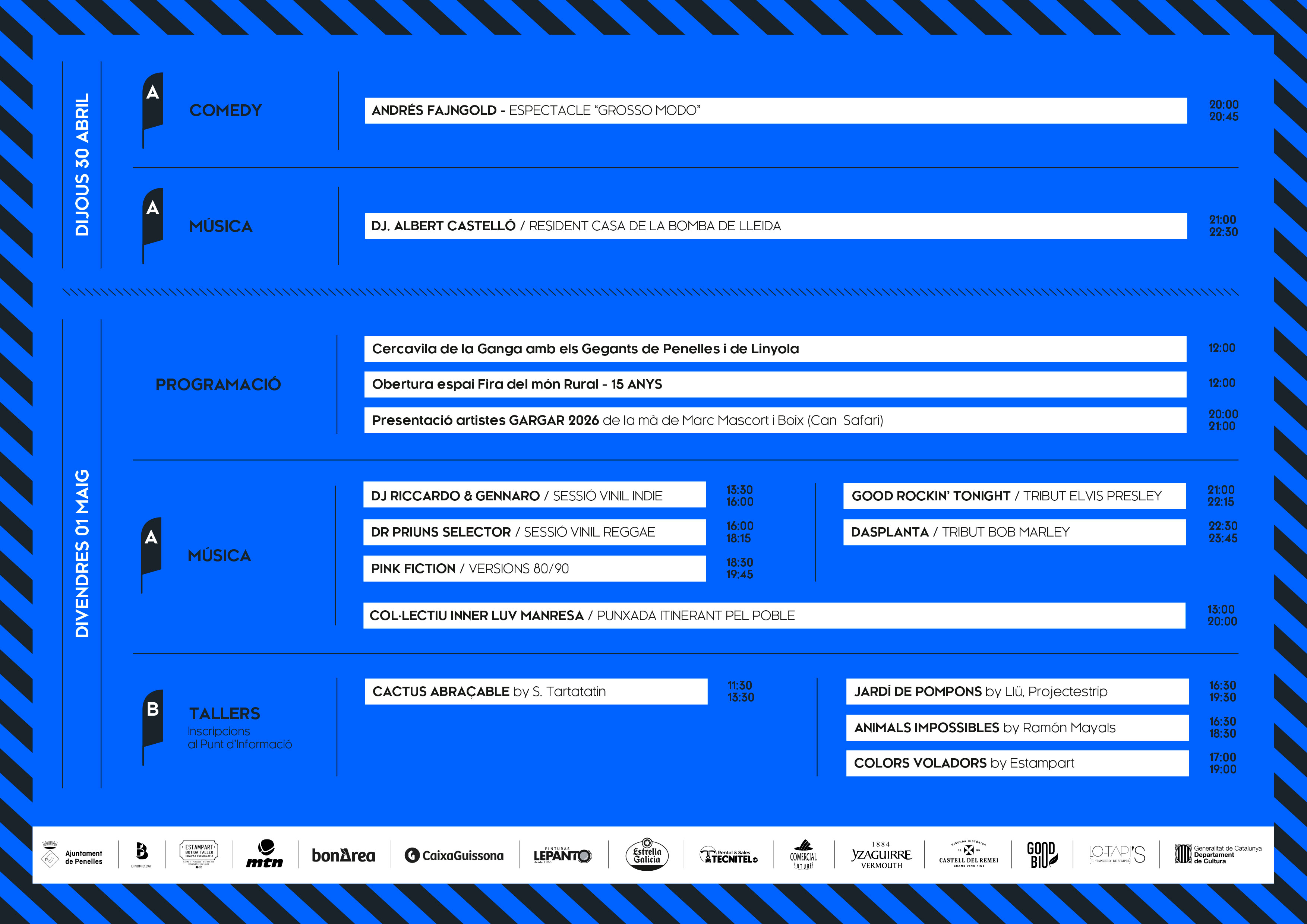 Aquest vespre el Gargar donarà el tret de sortida oficial amb el Gargar Comedy, que portarà a la plaça l’espectacle Grosso Modo amb Andrés Fajngold en una sessió gratuïta que combina humor, proximitat i esperit festiu. Amb aquesta proposta, el festival reforça el seu caràcter obert i transversal, ampliant la seva programació més enllà del muralisme i convertint la plaça en un primer punt de trobada per al públic.