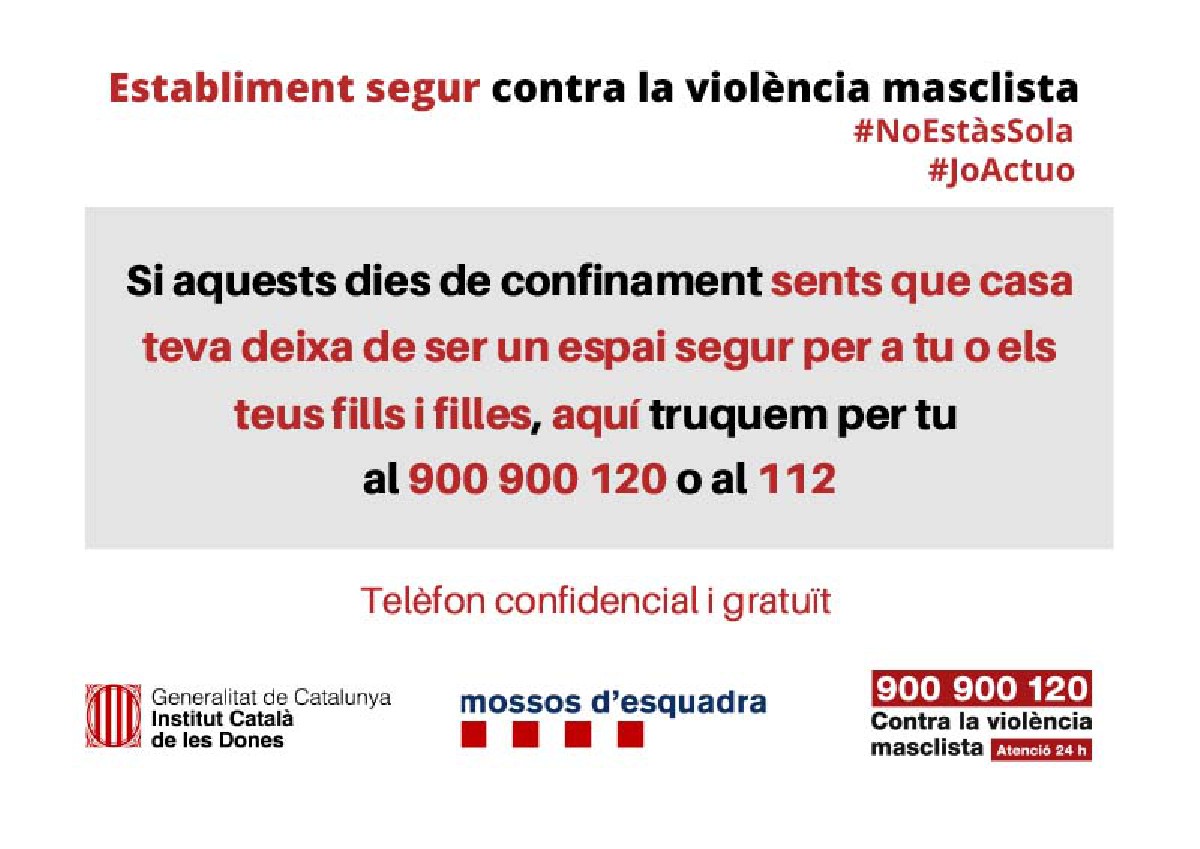 Des de la Policia de la Generalitat – Mossos d'Esquadra informa que han engegat un Pla de contingència per a la seguretat de les víctimes de violència masclista, domèstica i altres víctimes vulnerables, per garantir la seguretat davant l'actual situació pel COVID-19 que comporta una convivència permanent i la mobilitat reduïda de la ciutadania, fet que pot afavorir situacions d'abús i/o violència amb l'agreujant de la dificultat per a la víctima de no poder trucar als serveis, trobar suport de familiars, amistats o professionals.
