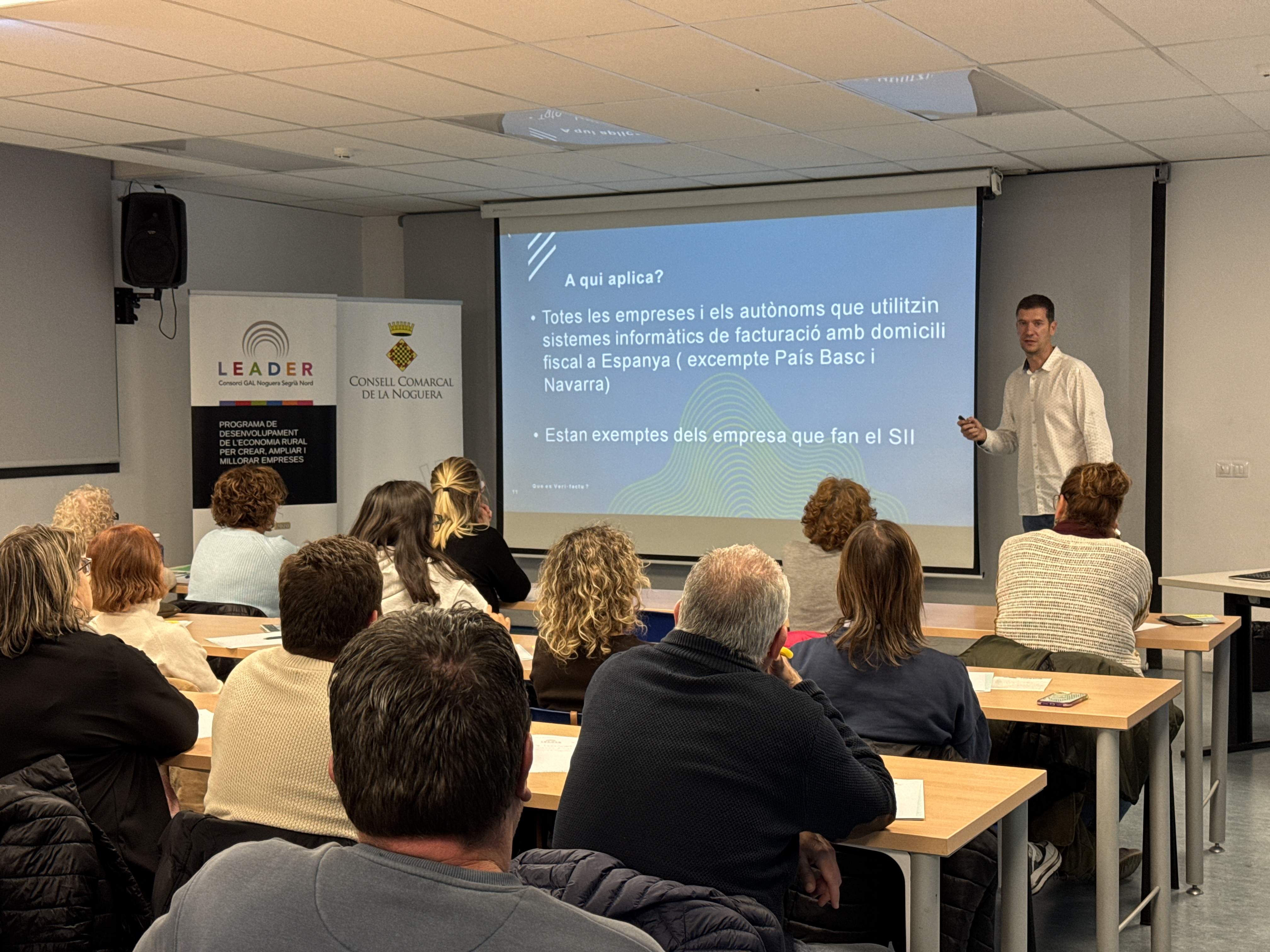 Balaguer ha celebrat aquest dimarts la segona sessió del cicle formatiu “De la gestió a l’èxit: potencia el teu negoci”, un programa adreçat a professionals i empreses que volen reforçar competències, millorar la gestió financera i guanyar visibilitat en un mercat cada vegada més competitiu. La sessió, dedicada al “Sistema de facturació: VeriFactu”, ha reunit prop d’una cinquantena de participants al CEI Balaguer.