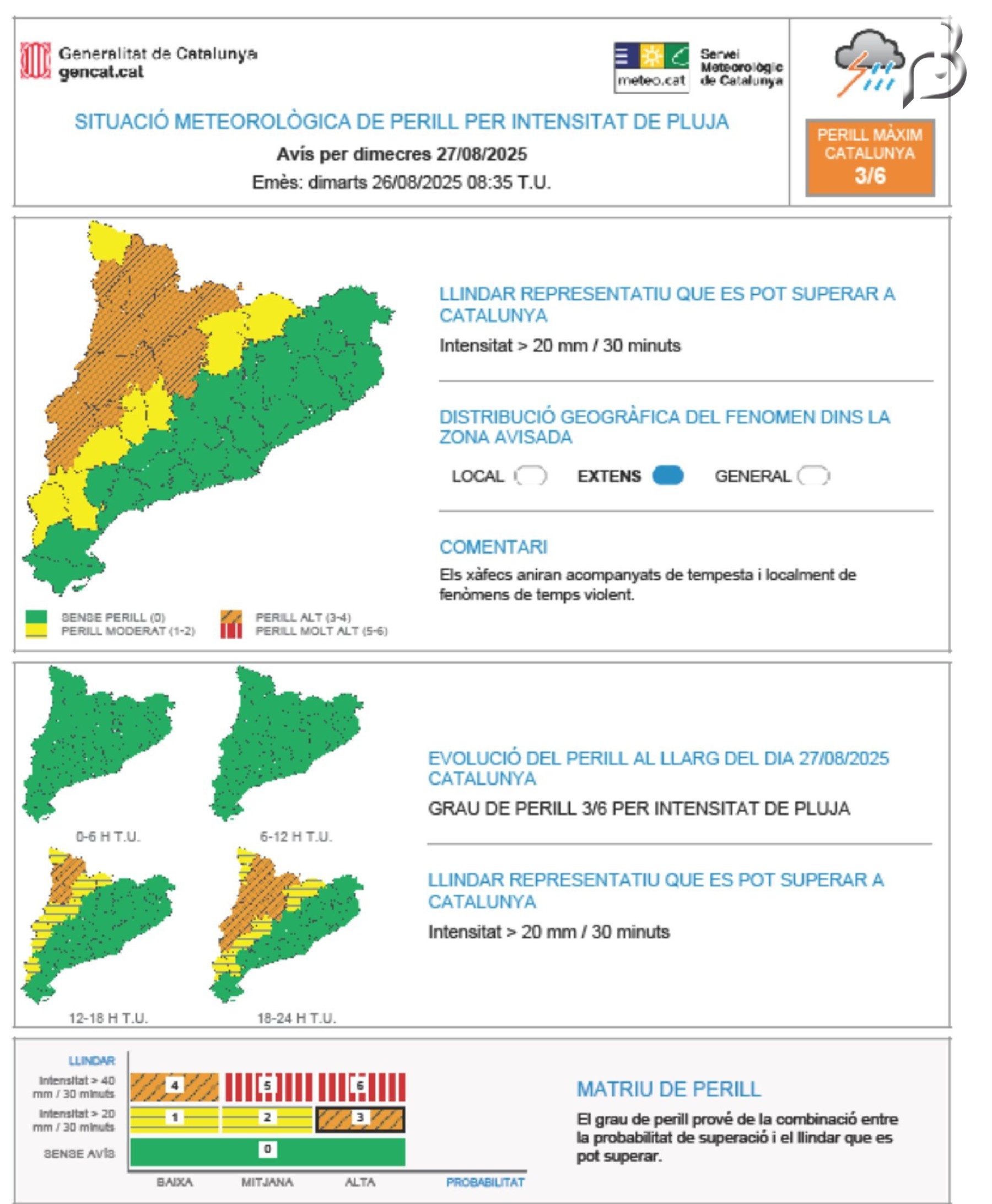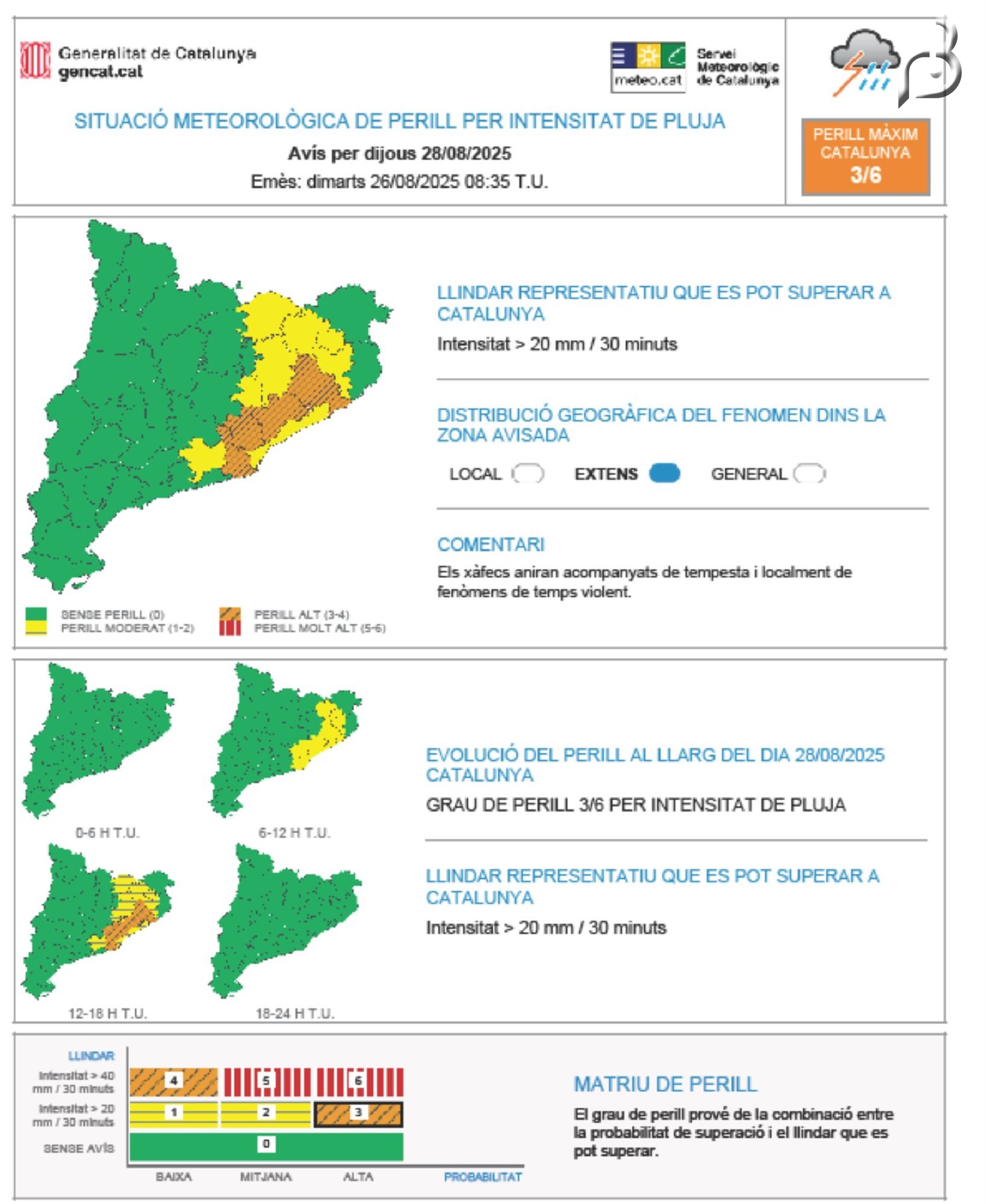 De cara a dijous, es poden superar aquests registres al Baix Llobregat, el Vallès i la Selva. També hi pot haver calamarsa i fortes ratxes de vent que acompanyin la tempesta. És per això que es recomana evitar desplaçaments, no aparcar ni acostar-se a zones inundables ni travessar cursos d'aigua.