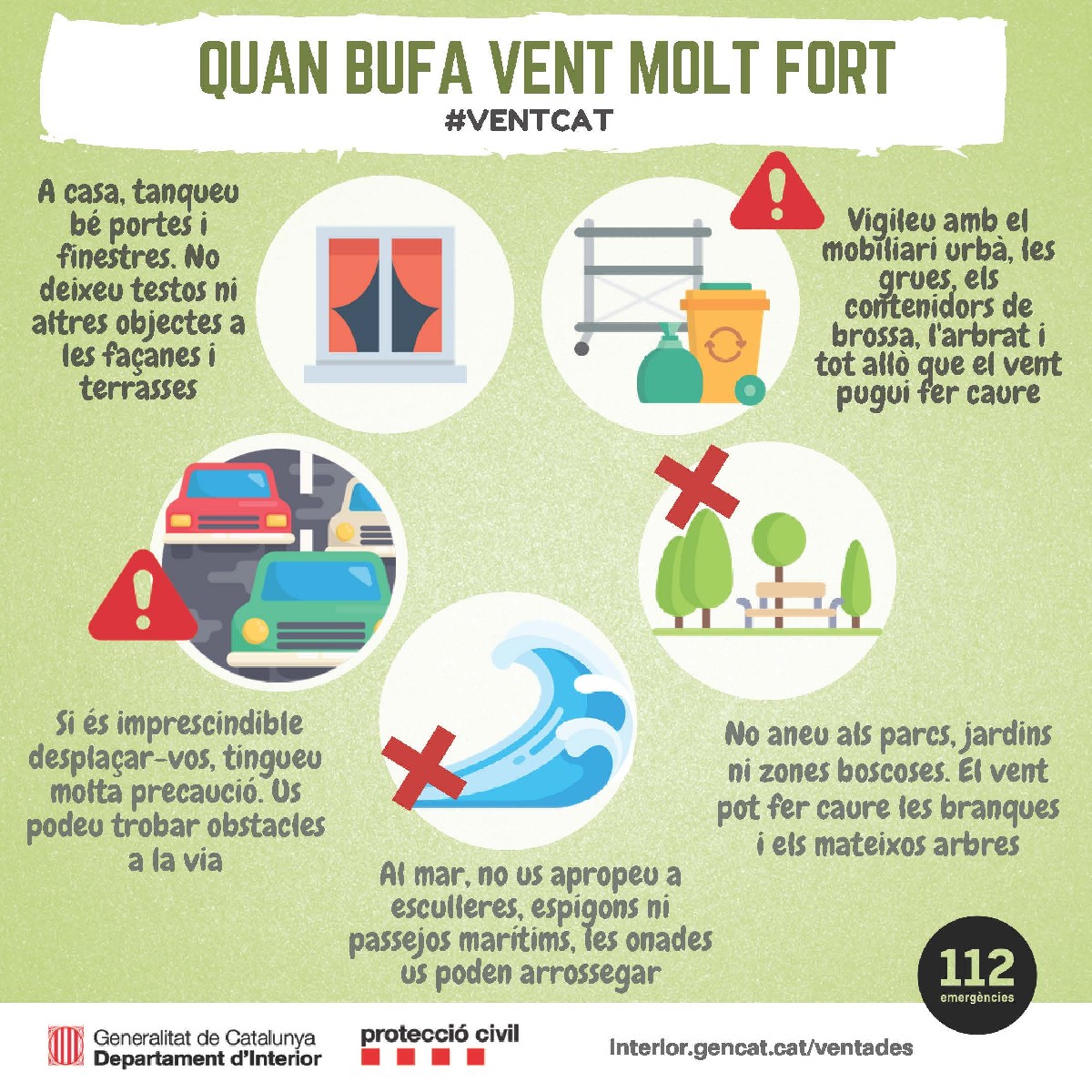 Protecció Civil de la Generalitat recomana molta precaució en els desplaçaments i en les activitats de lleure a l'exterior per la possible caiguda de branques, arbres i altres elements estructurals. En el moment de les ratxes més fortes cal evitar aturar-se a prop de murs de tancament o elements similars que poden caure per l'efecte del vent.