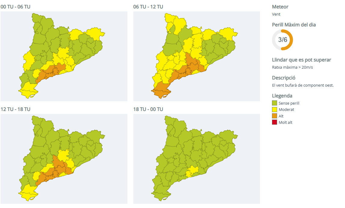 Després, però, l'actualització de la previsió indica que les ventades poden afectar qualsevol punt del país, fet pel qual Protecció Civil ha volgut subratllar el missatge de prudència a la ciutadania. Les ventades afectaran el territori tot dissabte, i diumenge es preveu que remetin.