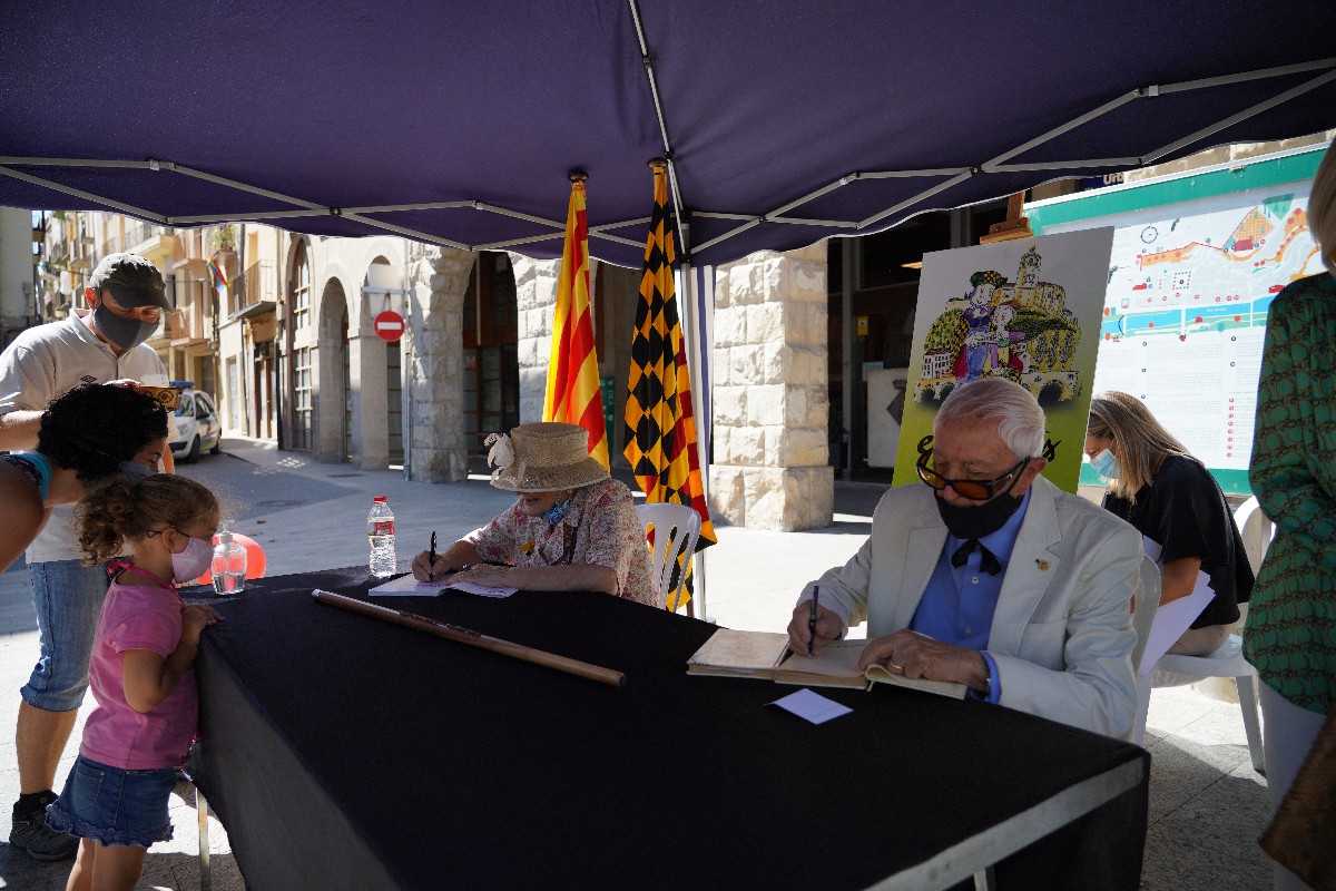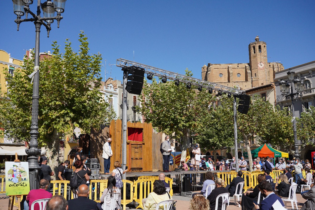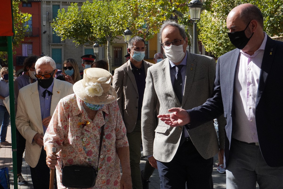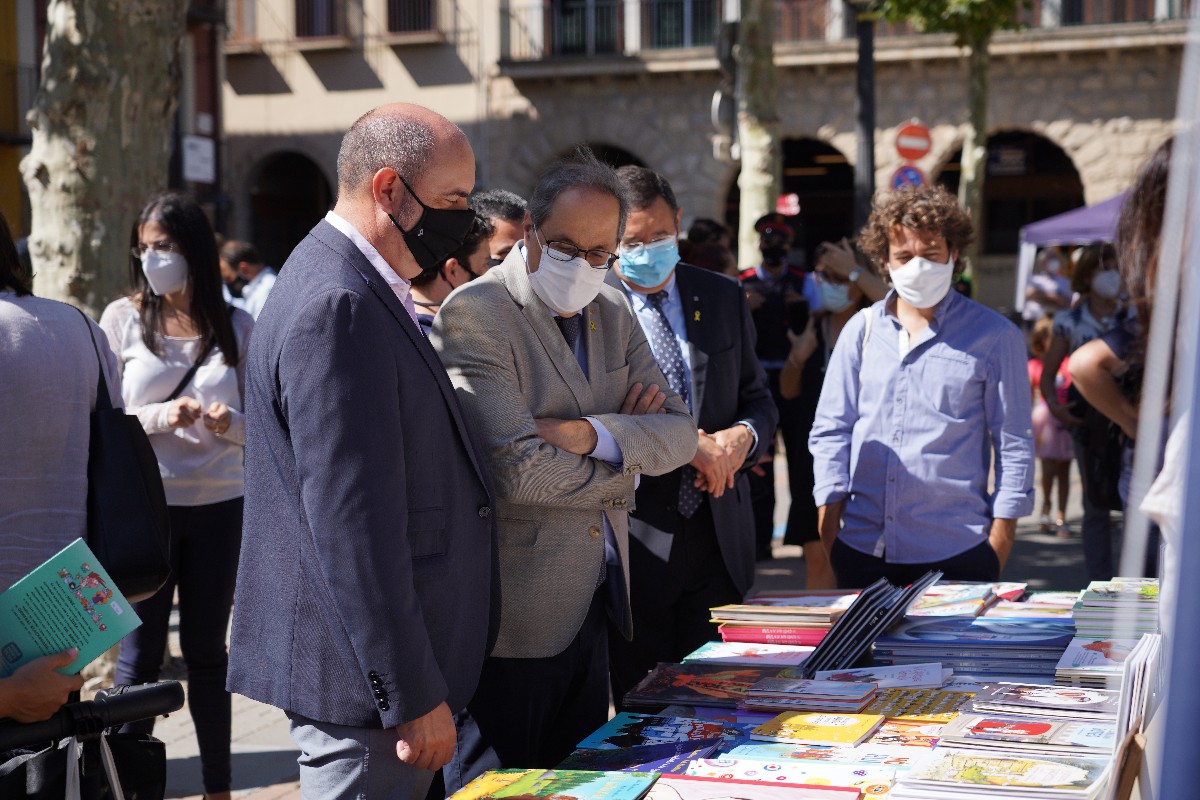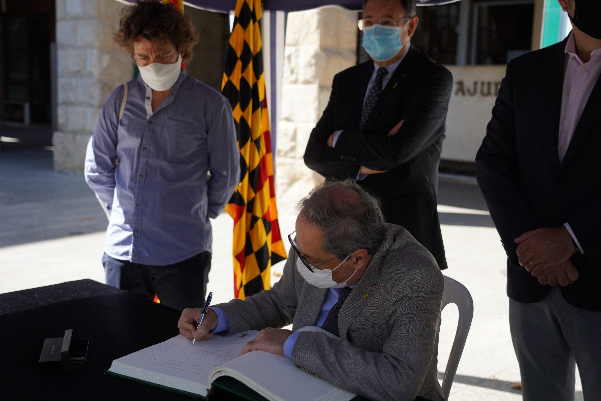 Torra ha dirigit unes paraules al públic assistent hi ha visitat, després d'inaugurar l'escultura de Rovelló, les diferents parades ubicades a la plaça del Mercadal i ha signat el llibre d'honor de la ciutat.