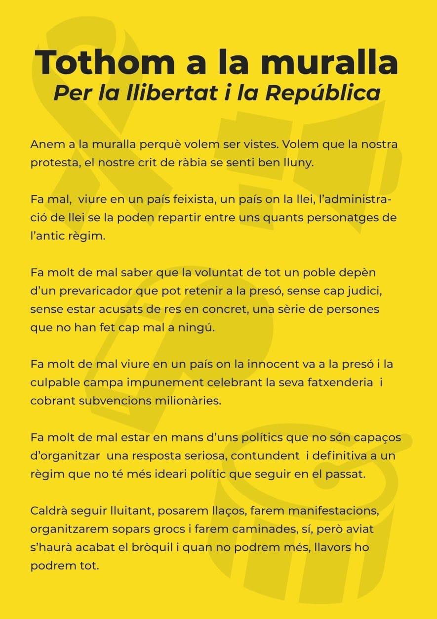 Des de les entitats organitzadores s'ha fet públic un comunicat on s'expressa que s'ha escollit la muralla per donar visibilitat a l'acte i per que s'escolti arreu de la ciutat. En el mateix escrit lamenten entre altres viure en un país feixista, la presó sense judici dels líders catalans i la desigualtat en l'aplicació de la justícia per idees polítiques.