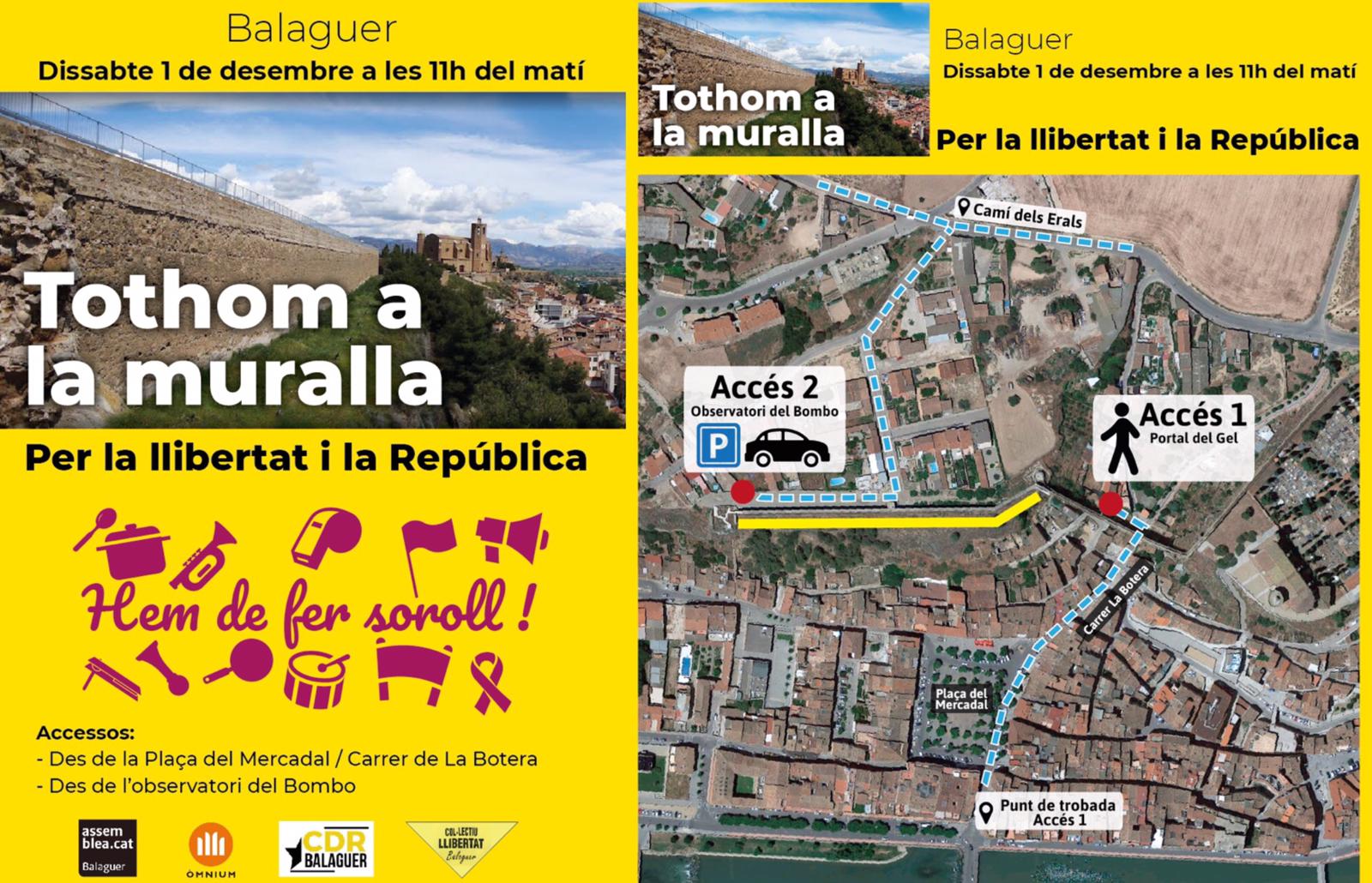 Diverses entitats de Balaguer, com són l'Assemblea, Òmnium Cultural, el CDR de Balaguer i el Col•lectiu Llibertat han organitzar per al proper dissabte dia 1 de desembre, a les 11 del matí, coincidint amb el mercat setmanal i el mercat de Santa Llúcia, una trobada sorollosa a la muralla medieval ubicada just a sobre de la Plaça del Mercadal.