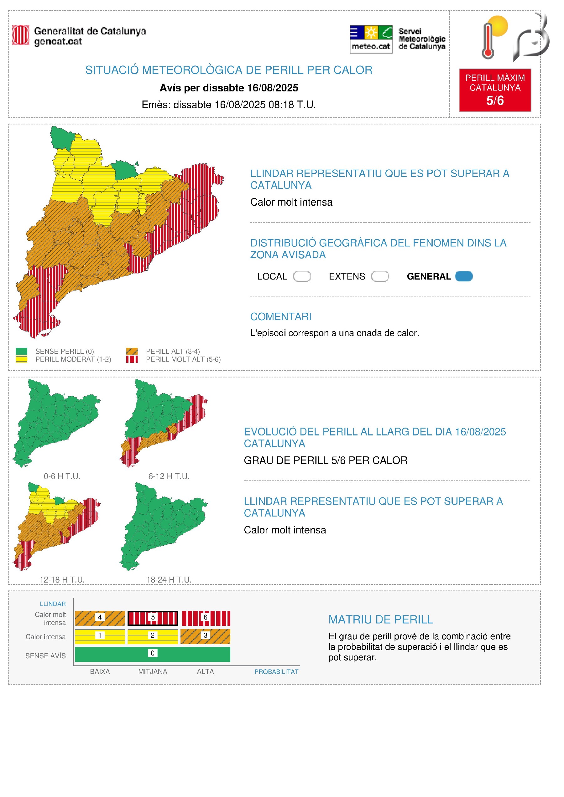 Aquest dissabte, el Servei Meteorològic de Catalunya també ha emès nous avisos de calor molt intensa que empitjoren les previsions que hi havia. Durant la jornada d'avui l'afectació de calor molt intensa serà generalitzada a tot Catalunya a partir del migdia i durant tota la tarda, a excepció de punts del Pirineu. Les comarques més afectades seran les del litoral central i litoral i prelitoral nord. També les comarques del Priorat, Ribera d'Ebre, Baix Ebre i Montsià.