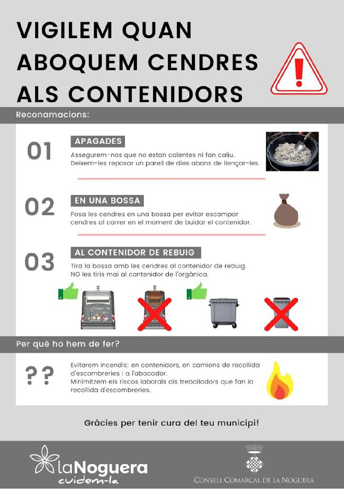 El Consell Comarcal de la Noguera fa una crida, mitjançant els ajuntaments de la comarca, a no abocar cendres enceses als contenidors pel risc d'incendi. Es tracta d'una pràctica que des de l'àrea de gestió de residus comarcal ja s'ha denunciat diverses vegades, havent repartit també cartellera sobre com s'han de gestionar aquest tipus de residus.
