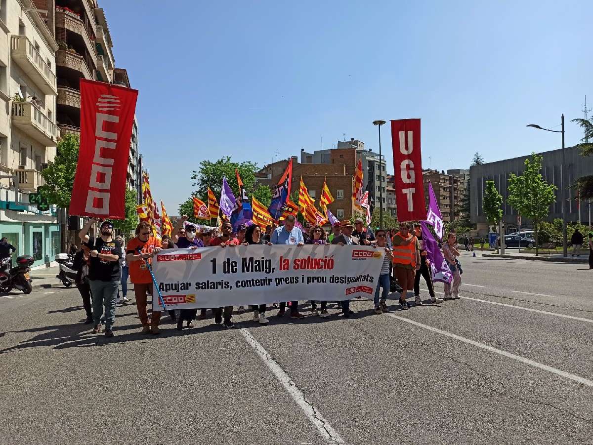 Una batucada ha encapçalat la manifestació del primer de maig a Lleida, que ha sortit puntualment a les 12 del migdia de la plaça del Treball i ha recorregut els carrers Prat de la Riba i Sant Martí fins a arribar a la Seu Vella. Durant el recorregut també s'han sentit xiulets i els manifestants duien cartells reclamant un augment dels salaris al mateix nivell que la pujada de preus i acabar amb les desigualtats. També un grup de treballadors d'Autobusos de Lleida reclamava que es complís el conveni laboral.