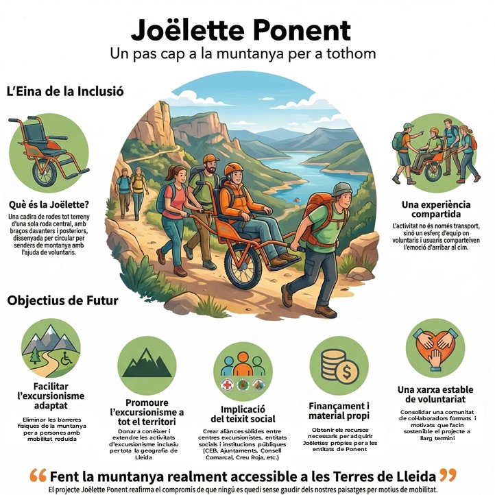 Un grup de persones de l’Urgell i la Noguera ha posat en marxa el projecte Joëlette Ponent – Muntanya per a Tothom, una iniciativa que vol facilitar l’accés a la muntanya a persones amb mobilitat reduïda mitjançant l’ús de cadires adaptades i el suport de voluntariat. El projecte compta amb la implicació del Centre Excursionista de Balaguer i el suport d’entitats del territori, amb l’objectiu de crear una xarxa estable d’excursionisme inclusiu a les Terres de Lleida, on actualment l’oferta és molt limitada.