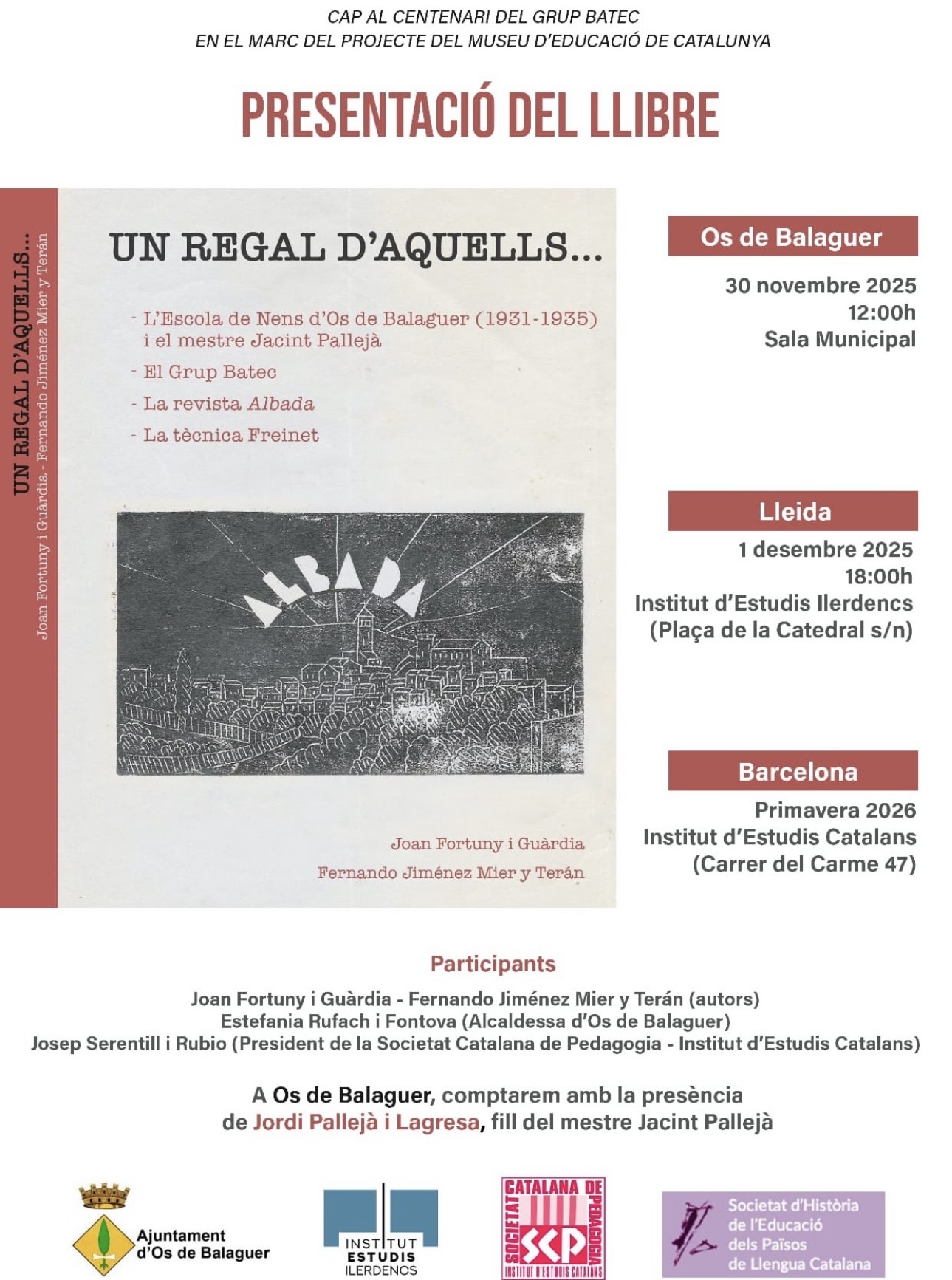 Os de Balaguer serà escenari diumenge de la primera presentació del llibre ‘Un regal d’aquells…’ un volum que posa el focus en l’Escola de Nens d’Os de Balaguer (1931-1935) i en la figura del seu mestre, Jacint Pallejà