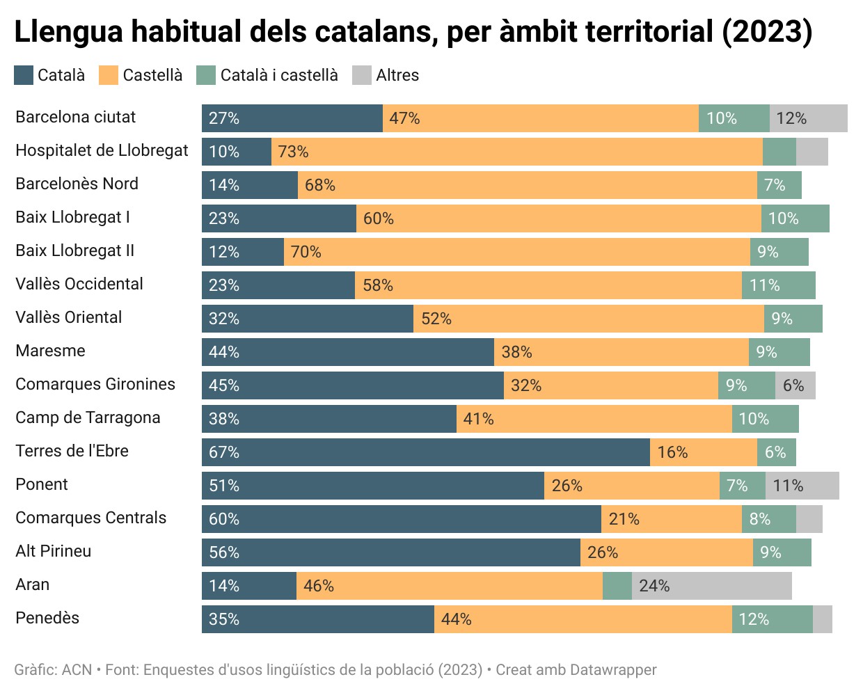 L'ús habitual del català retrocedeix a gairebé tots els territoris, amb caigudes de més de 8 punts a Pirineu i Girona. Ebre, Centrals, Ponent i Pirineu, úniques àrees amb més de la meitat de parlants de català, i Metropolità, menys del 25%