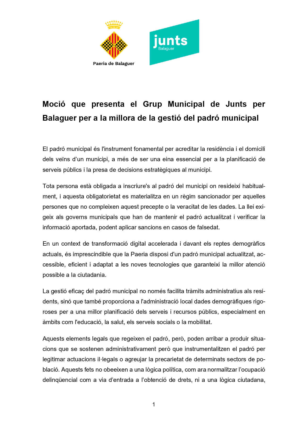 Junts per Balaguer presenta una moció en el ple de la Paeria d’aquest dijous per millorar la gestió del padró municipal
