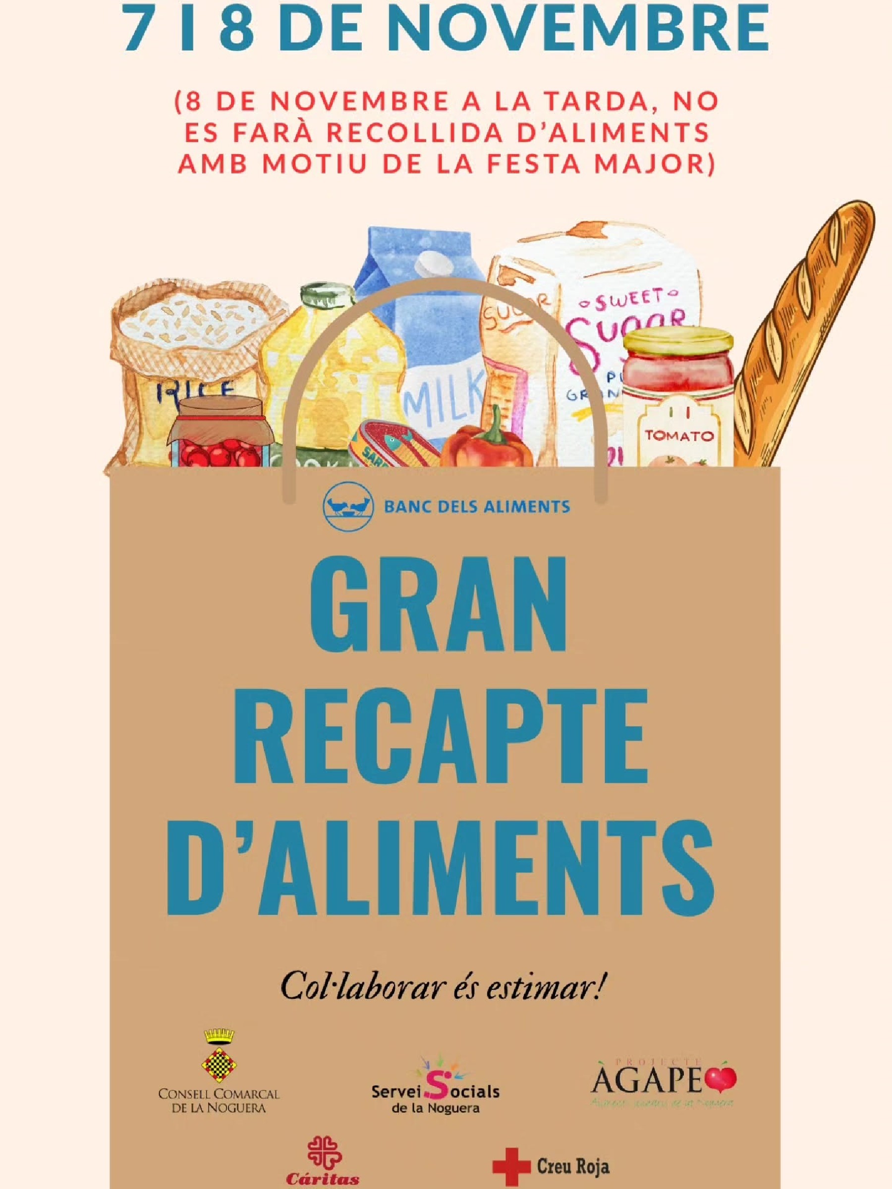 Aquesta setmana s'ha posat en marxa el Gran Recapte 2025 a la comarca de la Noguera. L'Àrea de Serveis Socials del Consell Comarcal fa una crida per trobar voluntaris per a la recollida d'aliments a Balaguer, que es durà a terme els dies 7 i 8 de novembre