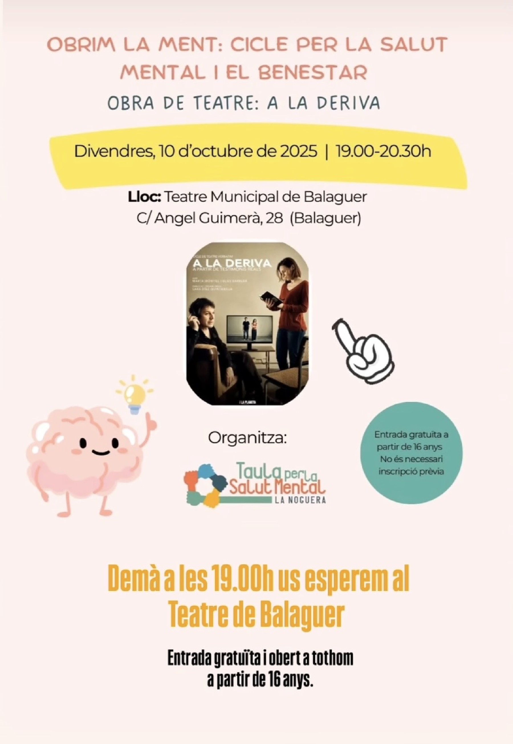 La Taula per la Salut Mental de la Noguera impulsa l'itinerari 'Obrim la ment: cicle per a la salut mental i benestar' a Balaguer. El cicle continua aquest divendres amb l'obra de teatre 'A la Deriva' al Teatre Municipal de Balaguer