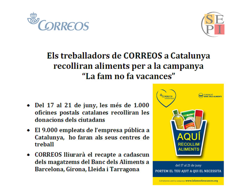 L'oficina de Correos de Balaguer se suma a la campanya 'La fam no fa vancances', que la fundació Banc dels Aliments porta a terme durant els mesos de juny i juliol. Els ciutadans que ho desitgin poden portar aliments a l'oficina del 16 al 21 de juny.