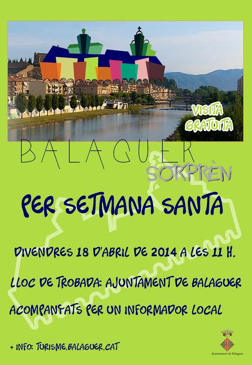 L'Oficina de Turisme de l'ajuntament de Balaguer ha preparat per aquest Divendres Sant una visita guiada gratuïta per la ciutat. El recorregut començarà a les 11 del matí a la plaça del Mercadal i acabarà a l'església de Sant Josep.