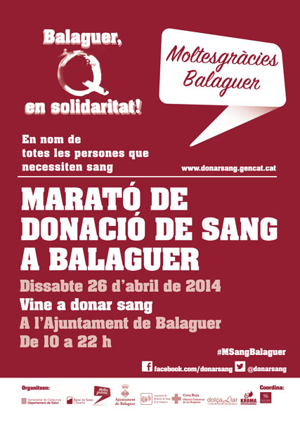Balaguer acollirà el 26 d'abril una nova edició de la Marató de Donació de Sang. Amb l'eslògan 'Balaguer, Q en solidaritat. Fes-te donant!', el municipi espera assolir un nou rècord de donants.