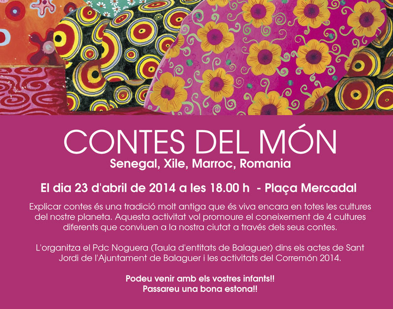 La Taula d'Entitats de Balaguer del PDC de la Noguera participarà en les activitats que es faran a Balaguer amb motiu de Sant Jordi. Ho farà amb l'activitat intercultural 'Contes del Món', inclosa també dins del Corremón 2014.