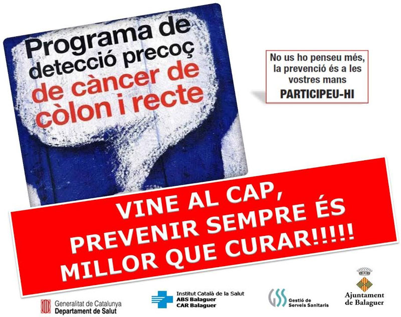 El 30 de març acaba el termini per participar al Programa de Detecció Precoç de càncer de colon i recte a l'Àrea Bàsica de Salut de Balaguer. El programa s'adreça a homes i dones de 50 a 69 anys amb la finalitat de detectar a temps els possibles casos.
