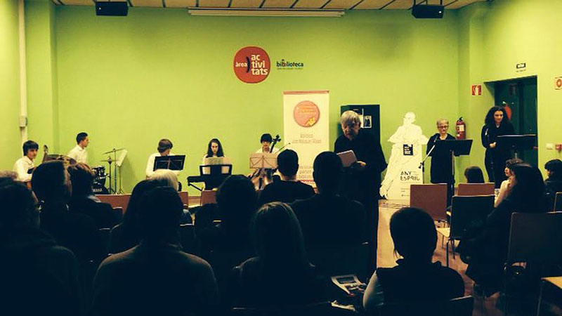 Una quarantena de persones presencien 'Espriuant Espriu' a Artesa de Segre. La representació es va fer divendres al vespre a la Biblioteca Joan Maluquer i Viladot.