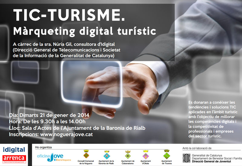 El proper dissabte dia 21 de gener tindrà lloc a la Sala d'Actes de l'Ajuntament de la Baronia de Rialb una jornada sobre Màrqueting digital turístic i de coneixements bàsics per a iniciar-se en l'aplicació de les TIC en un negoci.