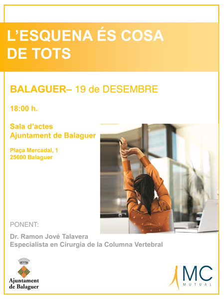 La Sala d'Actes de l'Ajuntament de Balaguer acollirà el proper 19 de desembre una xerrada divulgativa sobre el mal d'esquena.