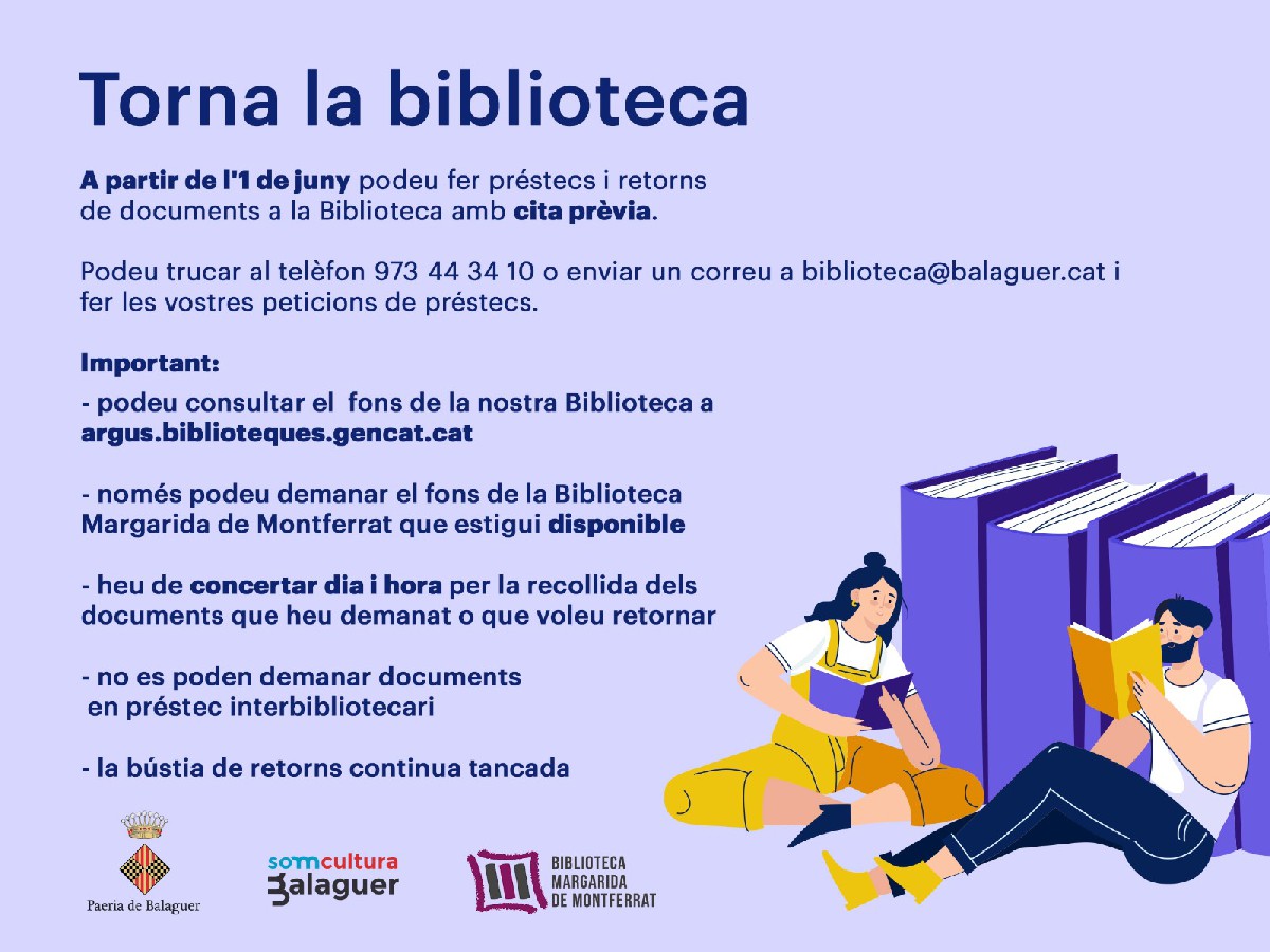 Entre l'1 i 2 de juny hi ha prevista l'obertura de 40 centres més, entre ells, la biblioteca municipal de Balaguer, que obrirà portes dilluns dia 1 de juny, tot i que no serà una obertura al 100 % sinó que, inicialment, només hi haurà actiu el servei de préstec i devolucions amb cita prèvia, segons ha confirmat la directora de l'equipament, Núria Arbós en declaracions a Ràdio Balaguer que també ens ha explicat que el servei no es farà a la planta de la biblioteca sinó que s'habilitarà un espai a la planta baixa de l'edifici. Per fer les diferents demandes, l'usuari pot consultar el catàleg de biblioteques.gencat.cat o trucar a la biblioteca.