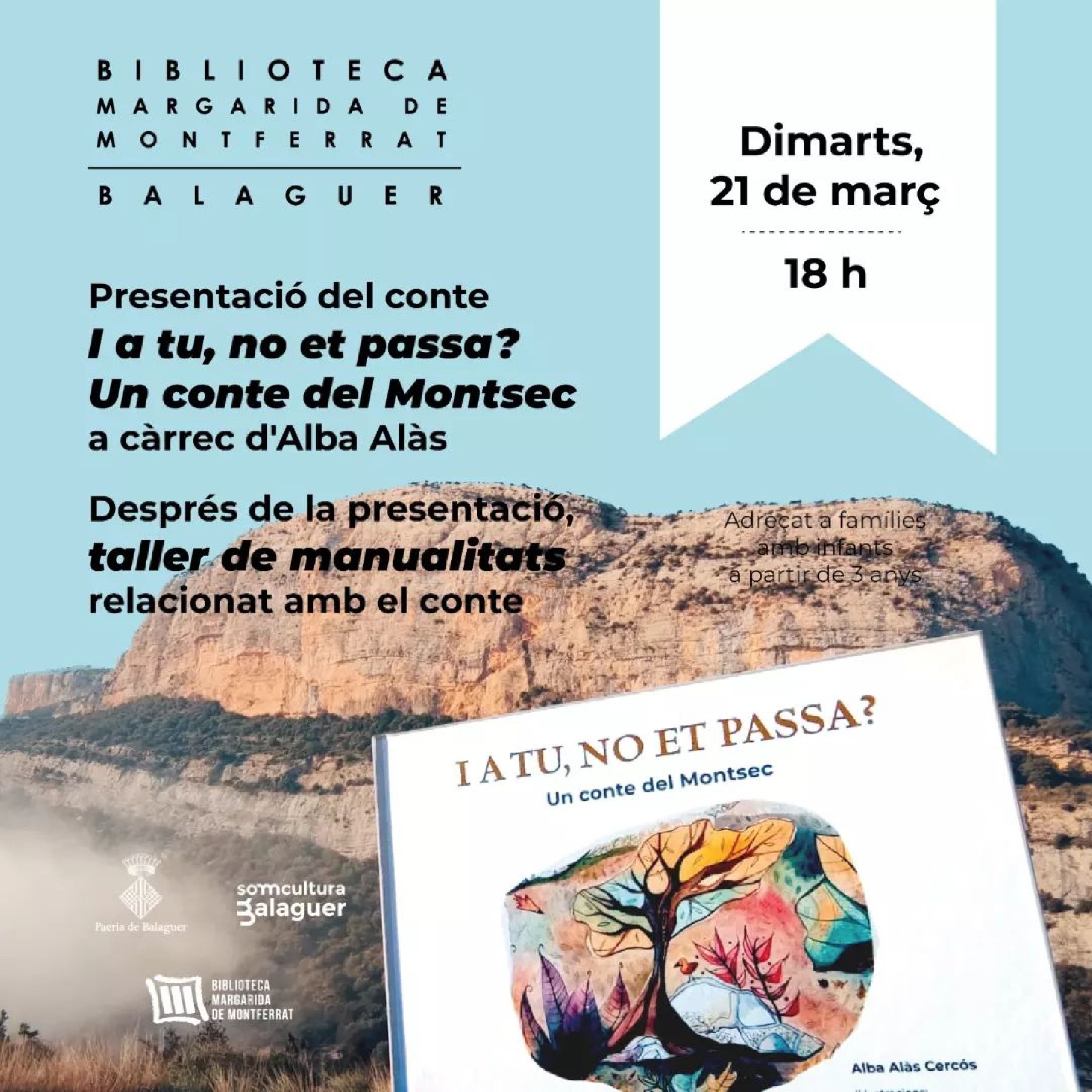 La Biblioteca Margarida de Montferrat acollirà el dimarts 21 de març a les 6 de la tarda la presentació del conte 'I a tu, no et passa? Un conte dedicat al Montsec' a càrrec d'Alba Alàs