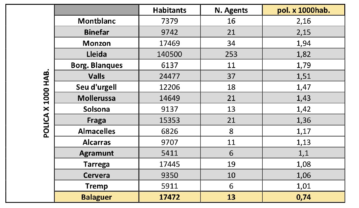 Balaguer, asseguren, és l'única policia, de les 17 estudiades, que està per sota d'1 agent per cada 1000 habitants i, a més, està molt lluny de municipis amb població similar, que tenen uns 33 agents de mitjana. És el cas, per exemple, de poblacions com Canovelles, Berga o Tordera.