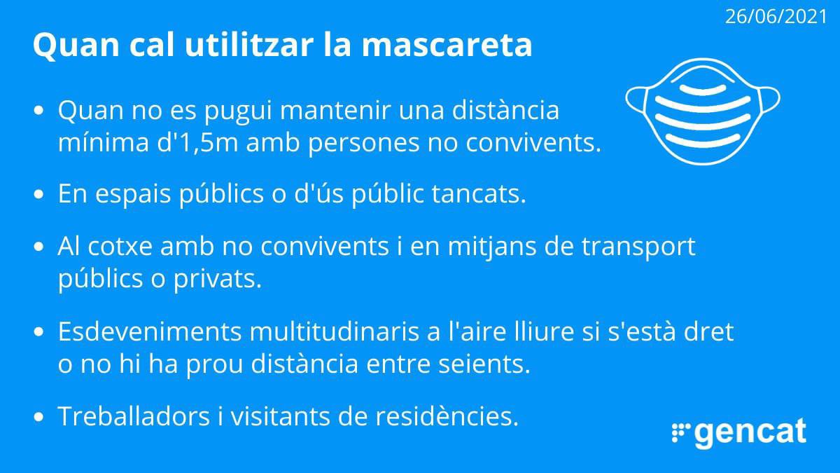 Així, la mascareta només serà obligatòria, a partir dels 6 anys d'edat, a tots els espais públics tancats i als espais a l'aire lliure on per l'aglomeració de persones sigui impossible mantenir una distància mínima d'1,5 metres entre persones de diversos grups de convivència. També serà obligatòria als mitjans de transport marítim, excepte dins de les seves cabines, aeri, d'autobús, telefèric o ferrocarril, inclosos andanes i estacions, així com els taxis i transports privats de fins a nou places si són de bombolles diferents. Els passatgers de vaixells no hauran de dur mascareta a l'exterior si poden mantenir 1,5 metres de distància amb els altres passatgers.