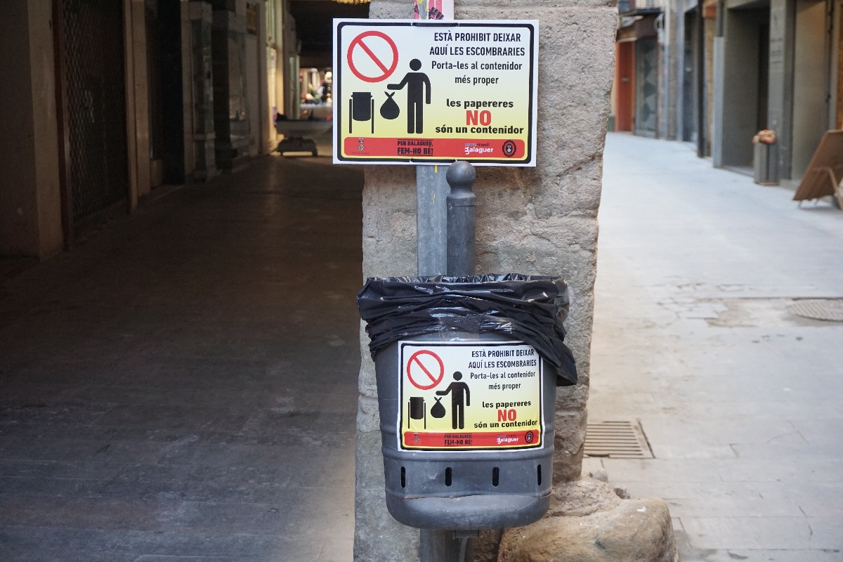 La Paeria de Balaguer ha començat una campanya d'acció i conscienciació contra la reiterada llençada de bosses d'escombriaires a les papereres del centre històric, un fet que últimament es repeteix sovint al carrer d'Avall, un dels carrers més conflictius.