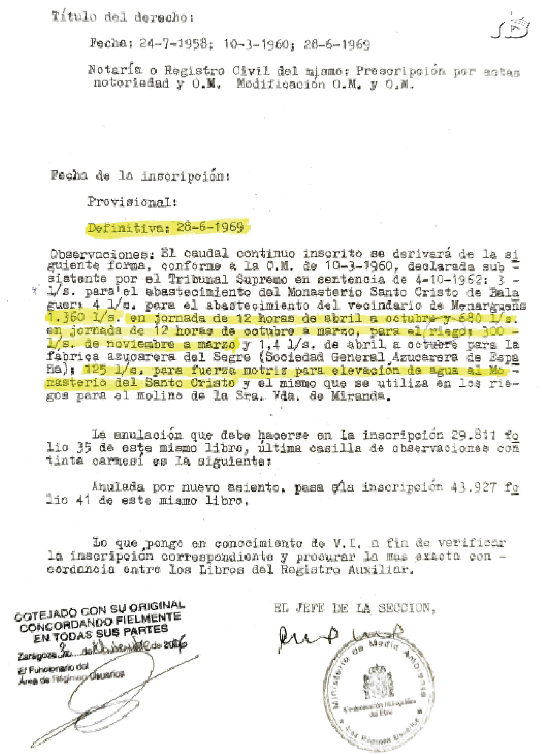 Els regants de Menàrguens sostenen que tenen el dret sobre l'aigua de la sèquia del Cup (i així els hi ha avalat per ara la justícia) però Balaguer també defensa que té aquesta prerrogativa. De fet, aquest document del 1969 estipula el cabdal que pot agafar Balaguer. És cert que no parla d'aigua de boca perquè el que es feia és bombejar l'aigua per fer llum amb un salt de sis metres per després elevar-la al "Santuario", on hi ha els dipòsits que abasteixen la ciutat.